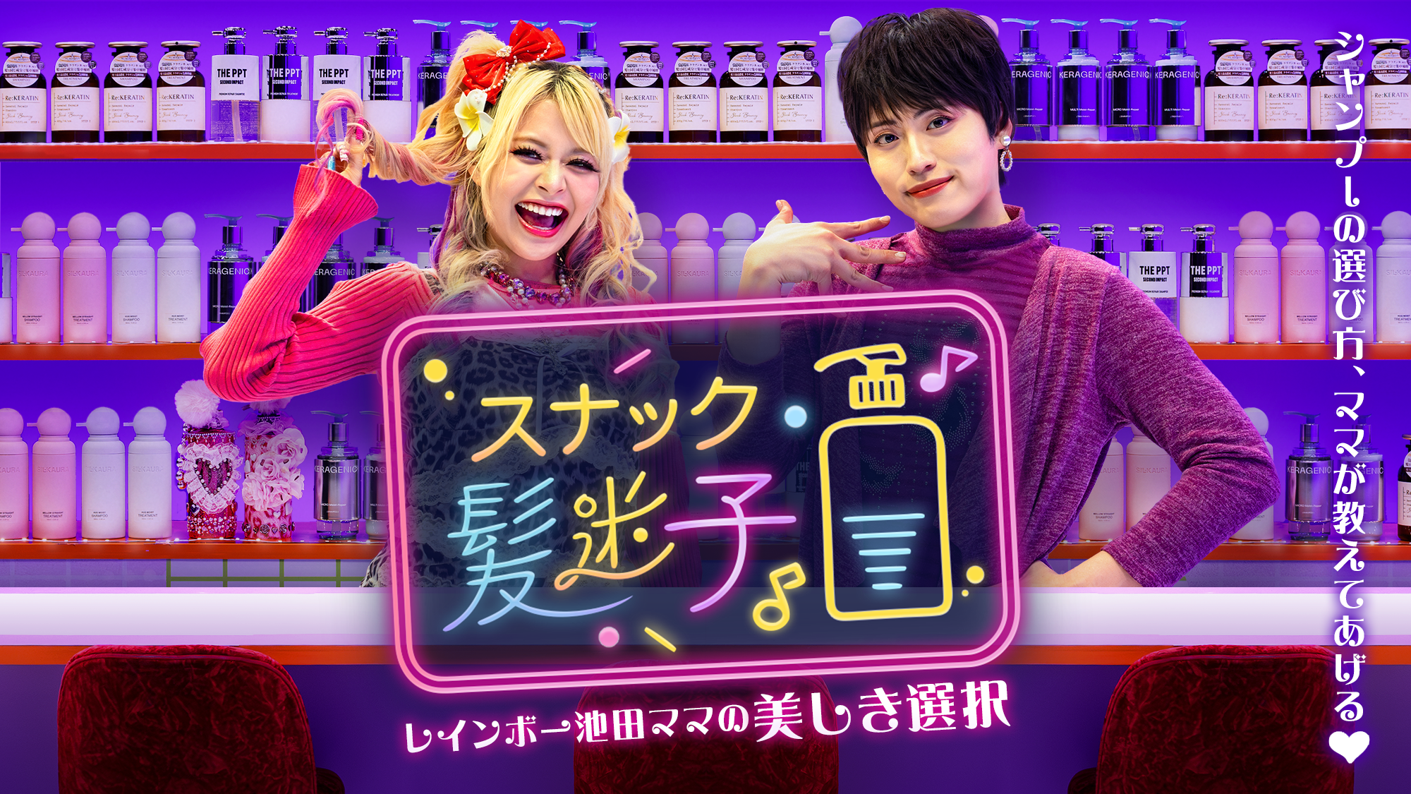 レインボー池田直人がスナックのママに扮し、悩める常連のエルフ荒川さんやチーママのかとゆりさんとともに、来店する”髪迷子”たちの悩みに向き合いながら、全成分表示の2番目に配合表記された「PPT*」成分のシャンプーがなぜ良いのか、笑いと共感の中で気づかせてくれるトークバラエティです。