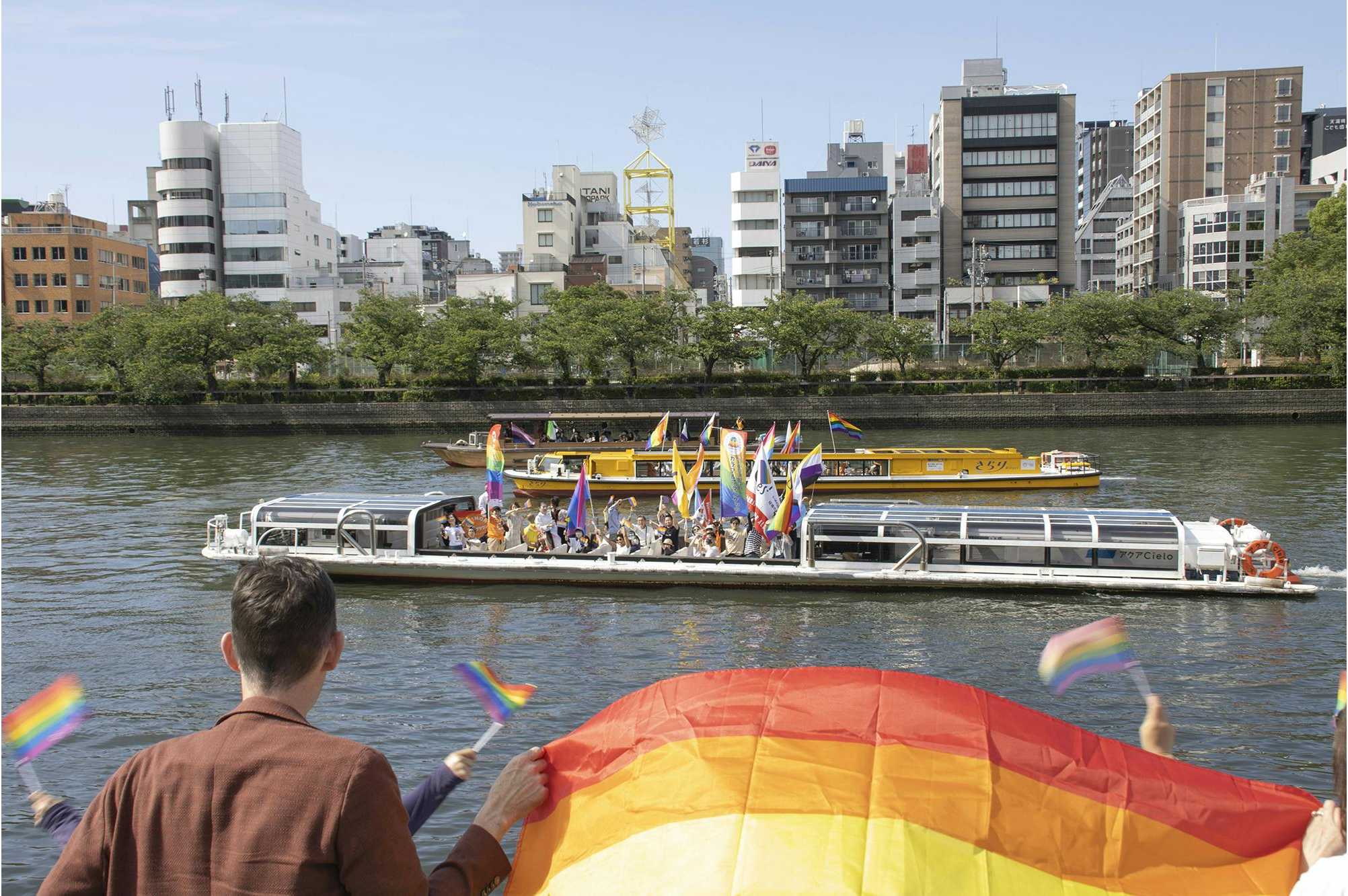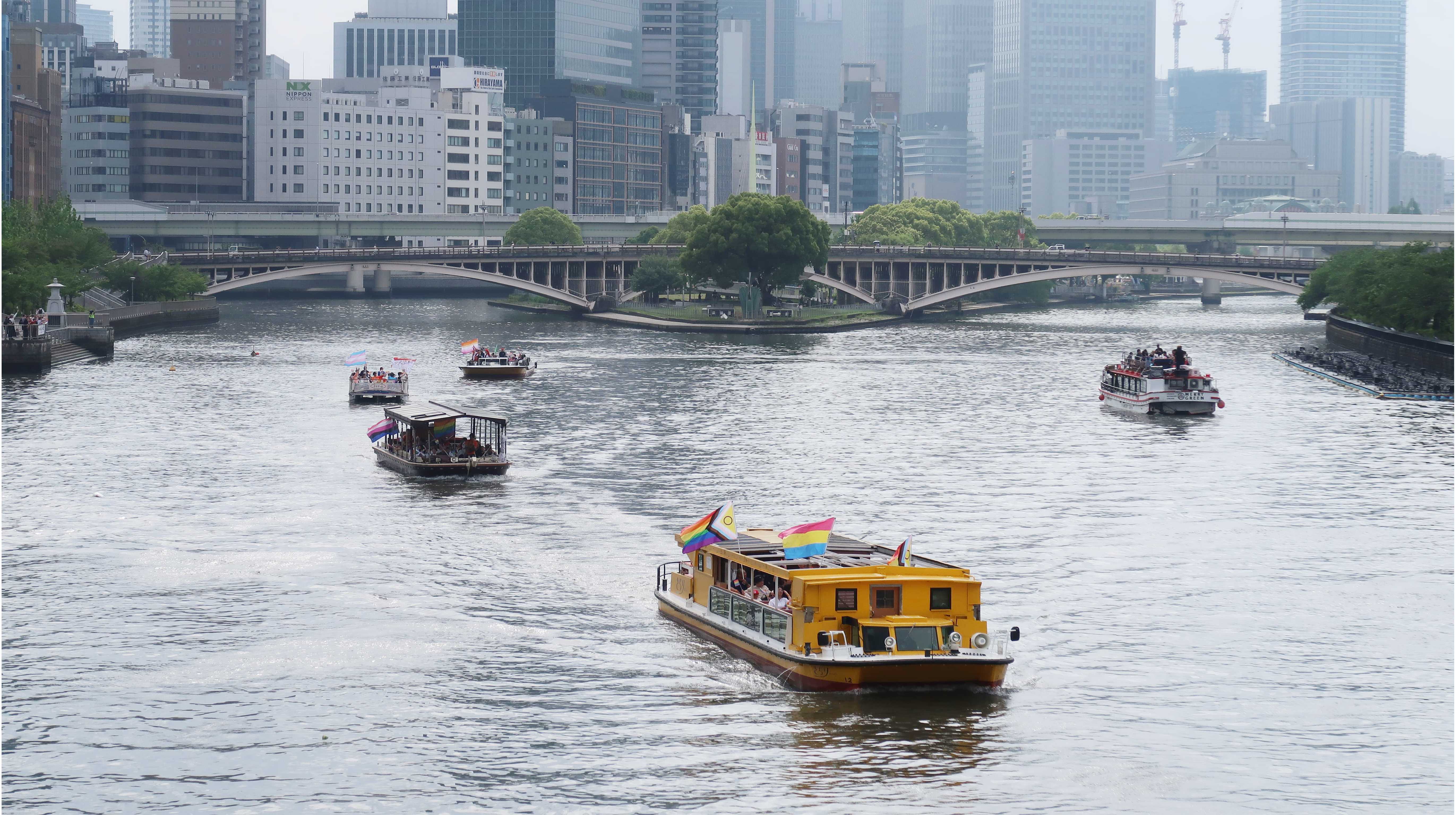 さまざまなプライドフラッグを掲げた船が、天満橋〜淀屋橋を周遊するユニークな水上パレードを実施します。今年は過去最大の6隻の船が参加予定で、川沿いから誰でも観覧・応援することができます。