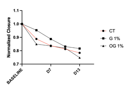 OG(オゾン化グリセリン)で処理したモデルは、G(グリセリン)群および対照群と比較して、その期間を通じて有意に創傷閉鎖が促進された。