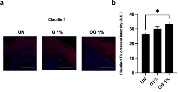 クローディン-1はOG(オゾン化グリセリン)処理培地において未処理群と比較して4日目に有意に増加したが、グリセリン処理培地では有意差は認められなかった。