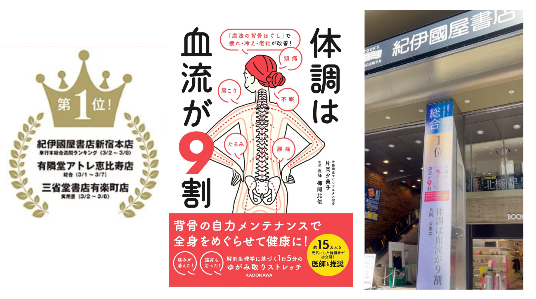 片岡は、解剖生理学の知見と現場経験から、肩こり・冷え・疲労・老化感といった不調の多くが“血流の滞り”に起因するという結論に至りました。そこから書籍『体調は血流が9割』(KADOKAWA)を出版すると、紀伊國屋書店新宿本店、有隣堂アトレ恵比寿店、三省堂書店有楽町店で、総合または実用書部門において売上ランキング1位を獲得いたしました。この書籍で提唱しているのが、「魔法の背骨ほぐし」です。