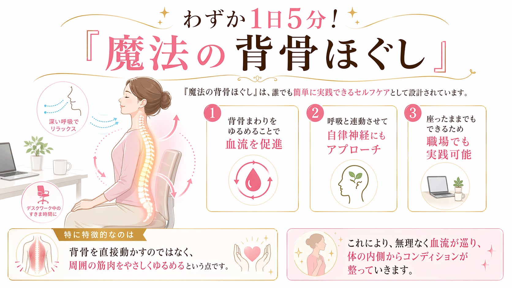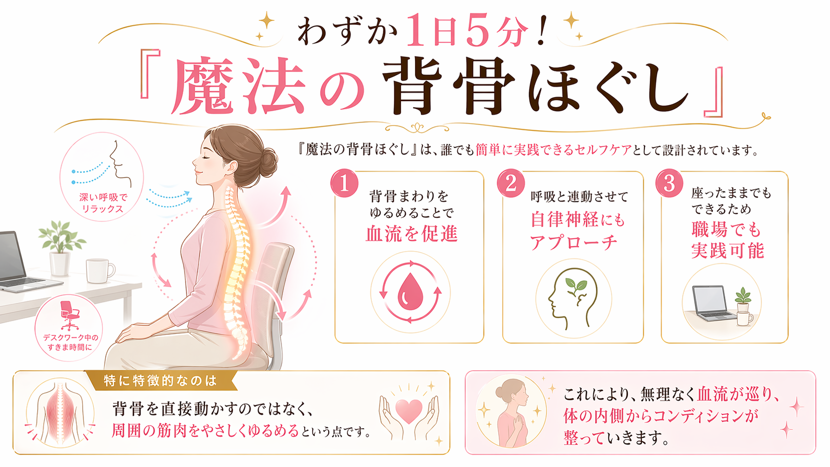 「魔法の背骨ほぐし」は、誰でも簡単に実践できるセルフケアとして設計されています。