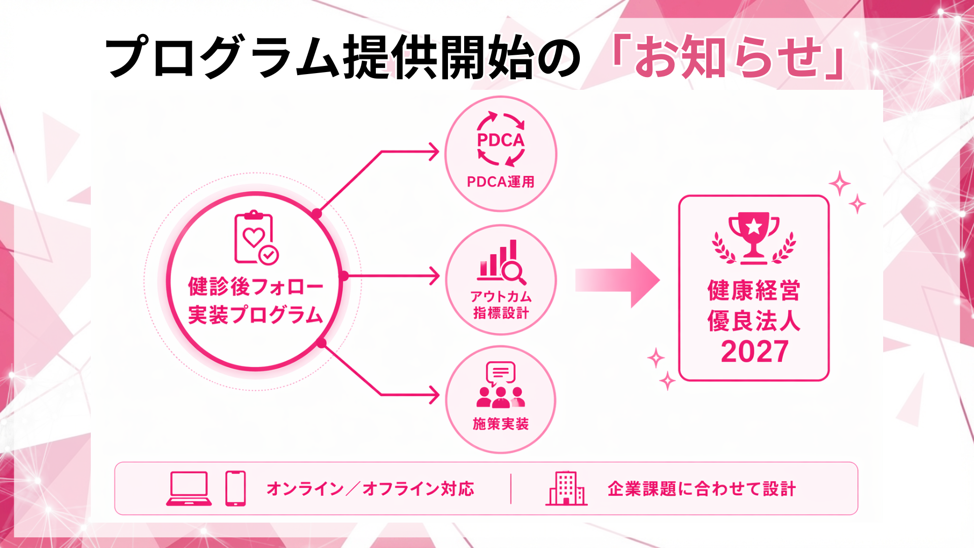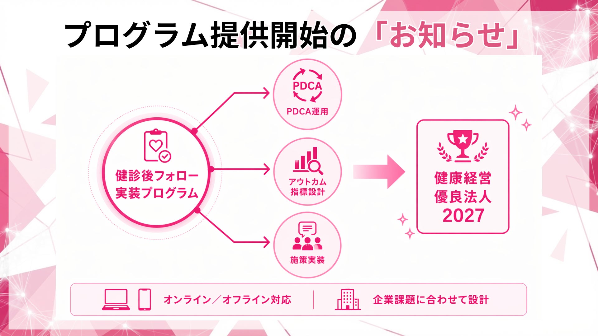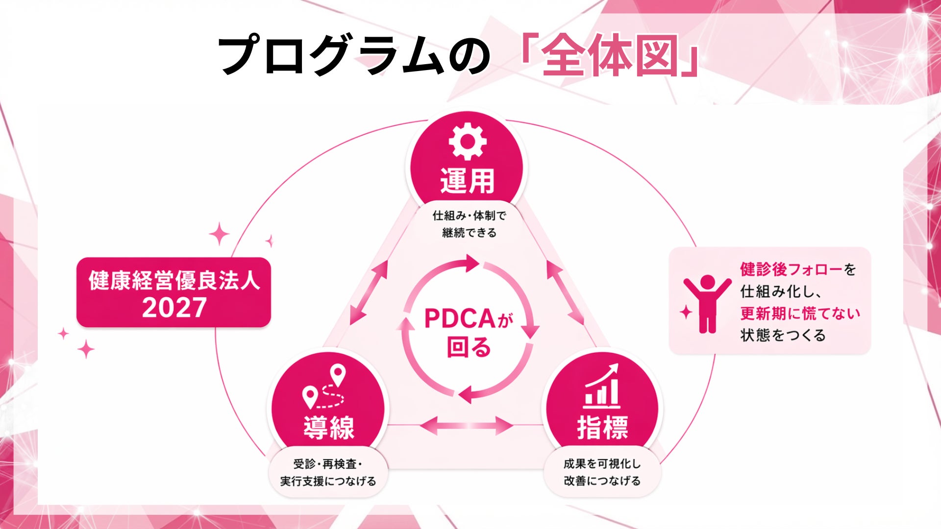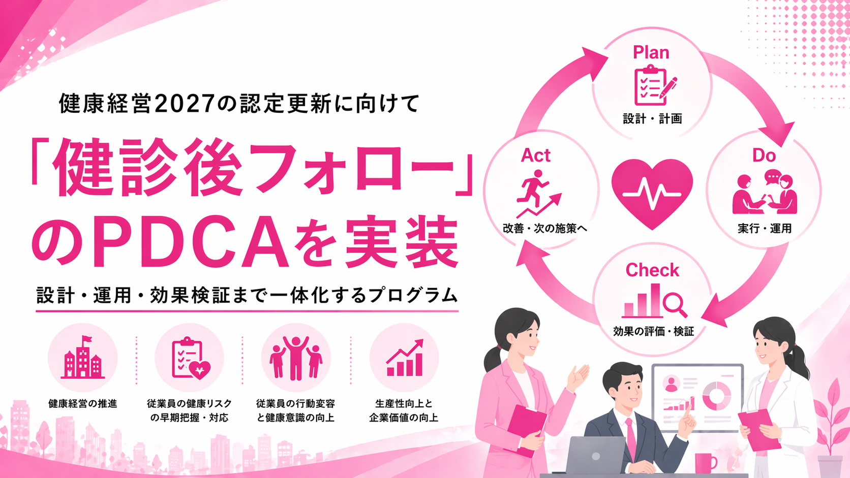 本プログラムは、健康経営優良法人2027に向けて、健診後フォローを運用として実装し、アウトカム指標を置いてPDCAを回すための支援です。