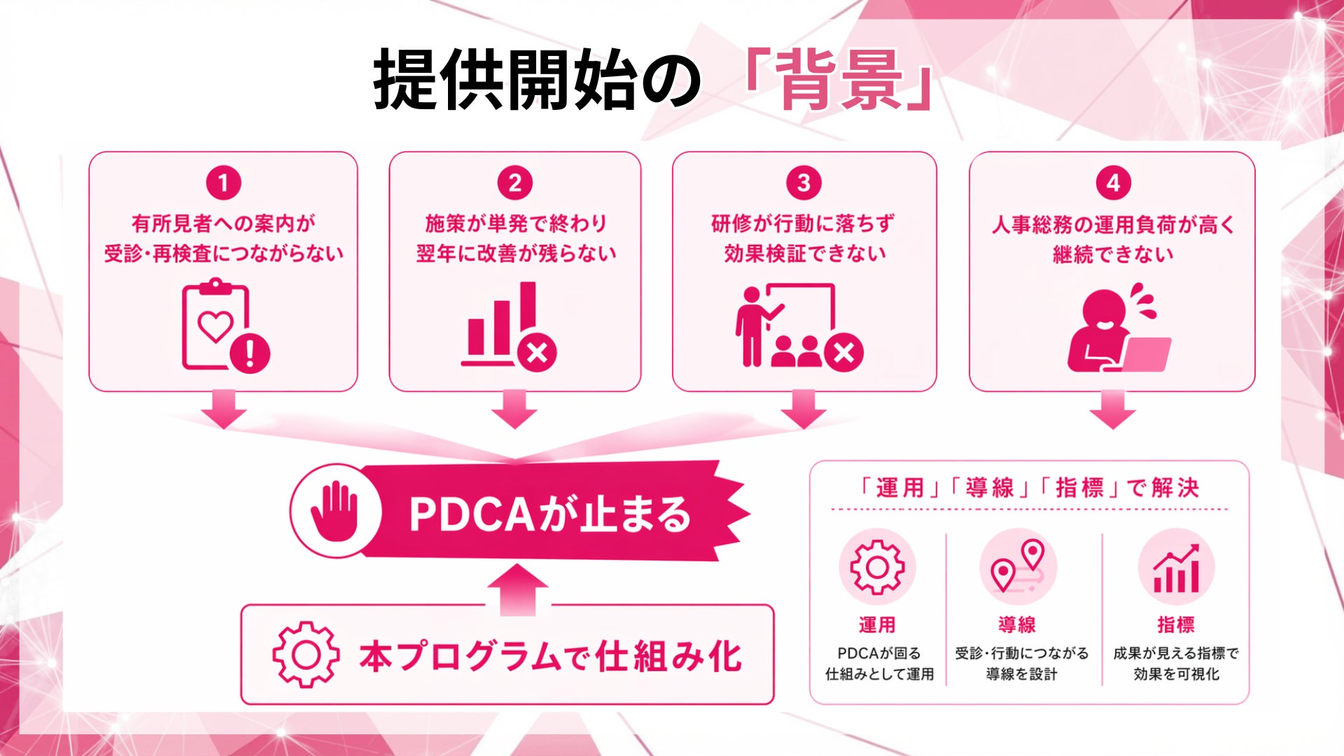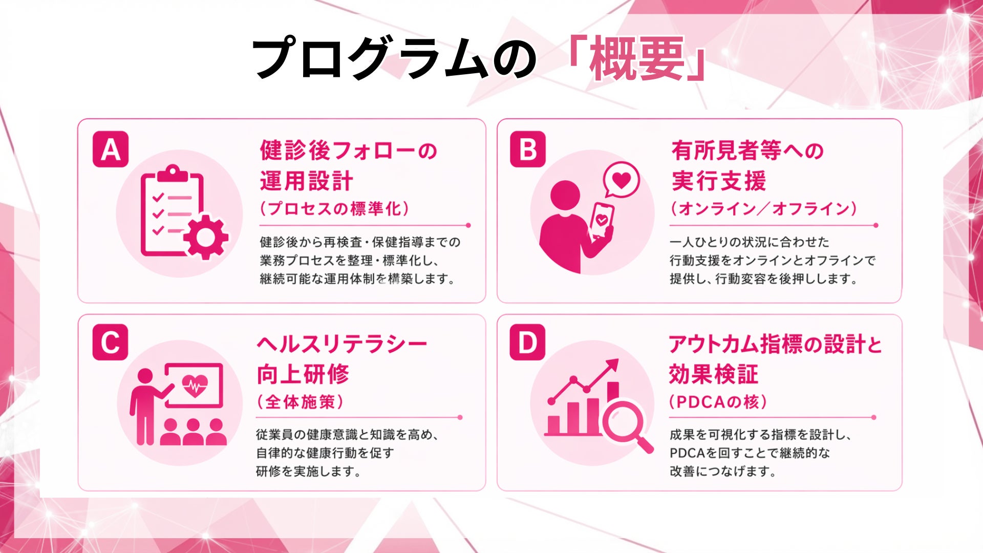 本プログラムは、健診後フォローを「運用」「導線」「指標」で仕組み化し、更新期に慌てない状態を作ることを目的に設計しました。
