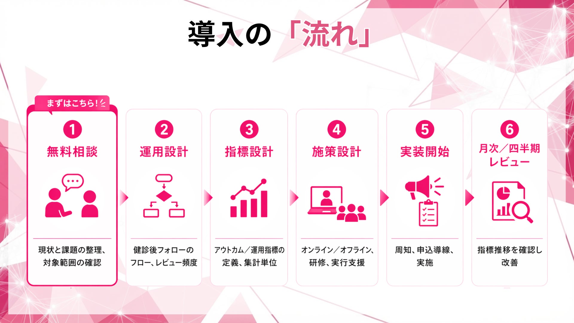本プログラムは医療行為(診断・治療)を提供するものではありません。個人情報の取り扱いは、本人同意、閲覧権限、集計粒度を事前に定義し、企業規程に沿って運用します。数値改善を保証するものではありません。運用として改善確度を上げる設計を行います。