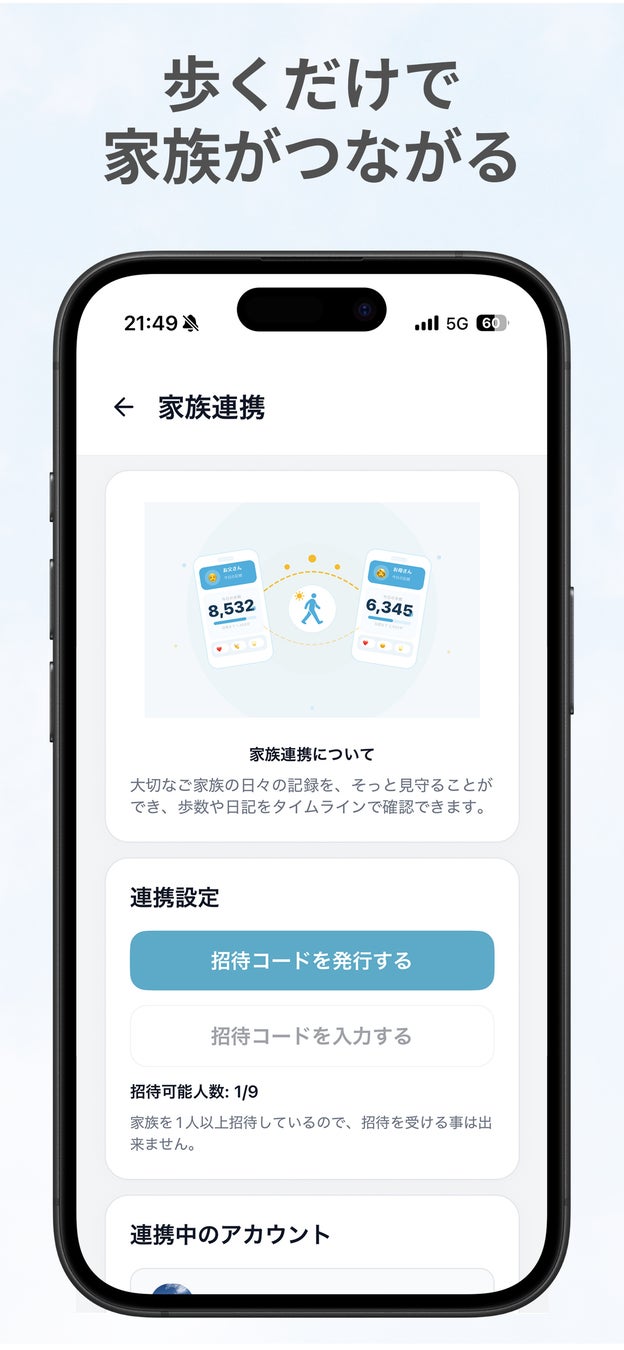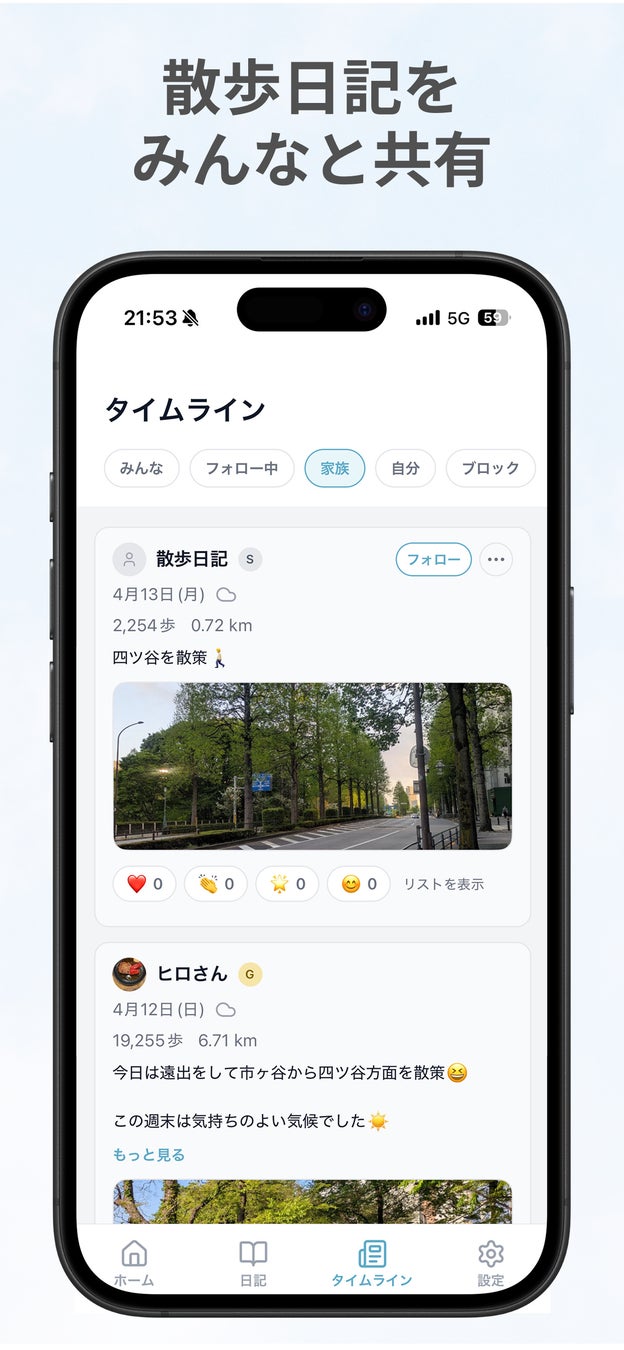 招待コードを使うだけで家族と繋がることができ、お互いの歩数や散歩記録をタイムラインで確認できます。コメント機能はなく、スタンプリアクション(❤️ 👏 🌟 😊)のみを採用。