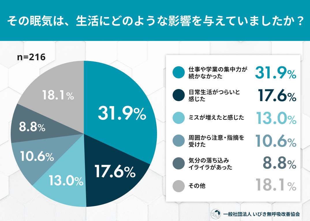 生活への影響:最多は「仕事や学業の集中力が続かない(31.9%)」。ミス増加や精神的な落ち込みも