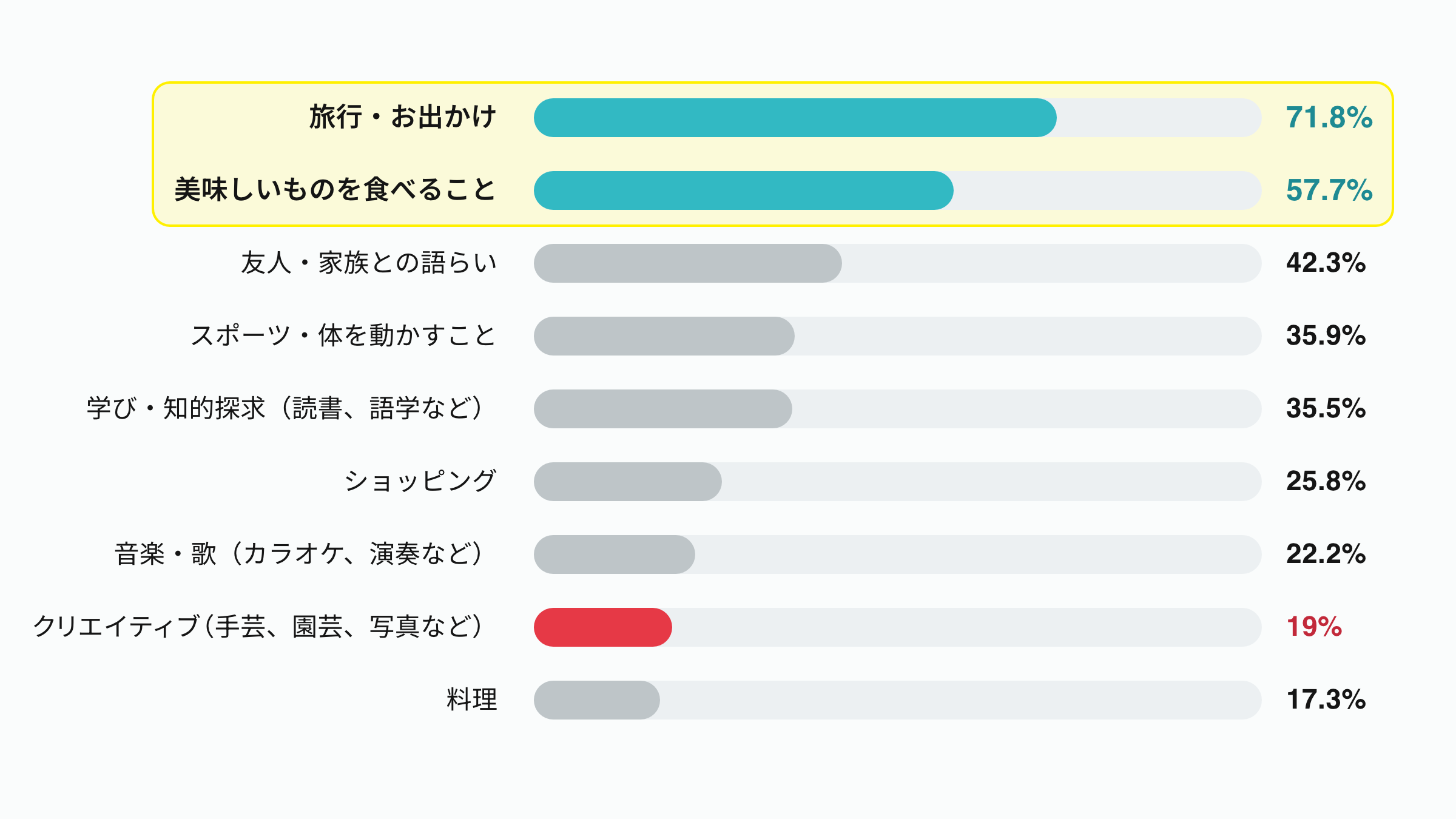 一生楽しみたい趣味のトップは「旅行・お出かけ(71.8%)」。シニアのイメージとして描かれがちな「手芸・園芸などのクリエイティブ」は19.0%にとどまり、シニアの関心が強く「外(体験)」に向かっていることが判明。