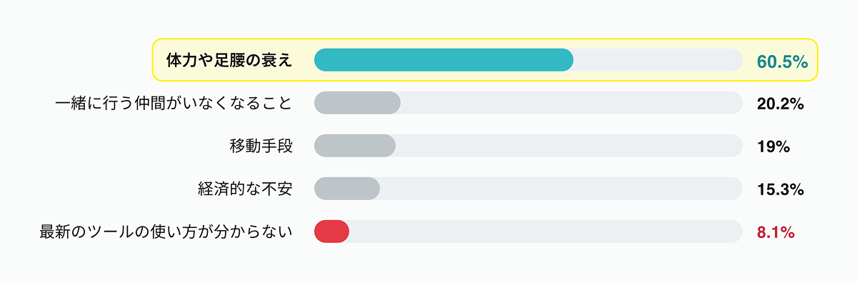 楽しみを阻む不安要素のトップは「体力や足腰の衰え(60.5%)」。対して、「最新ツールの使い方がわからない」というデジタル不安はわずか8.1%と、全項目で最低水準に。
