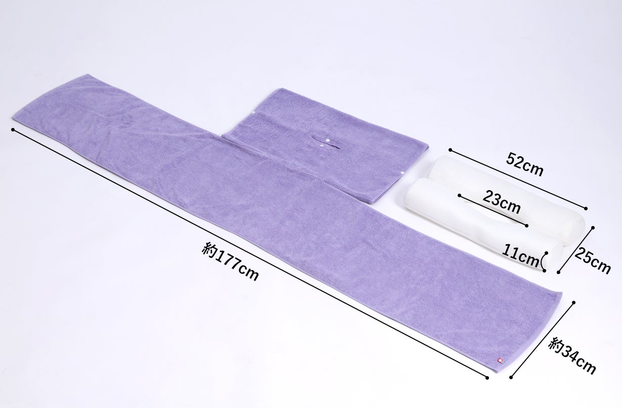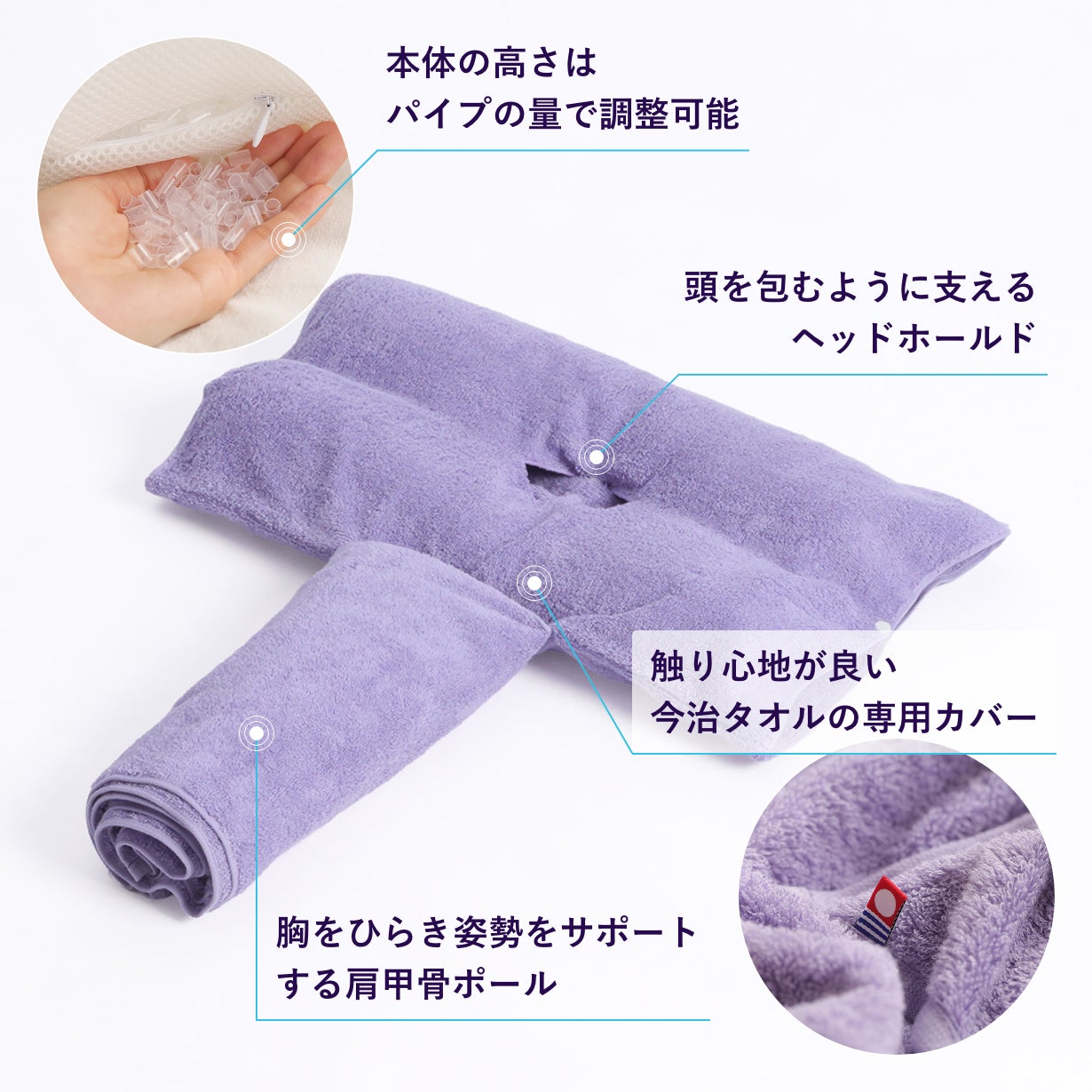 首や肩の圧力を分散する枕、肩甲骨ポールによる姿勢サポート、使い方を自分で調整できる今治タオルカバーで、寝転んだ瞬間から起きるまでを心地良いととのう時間に。