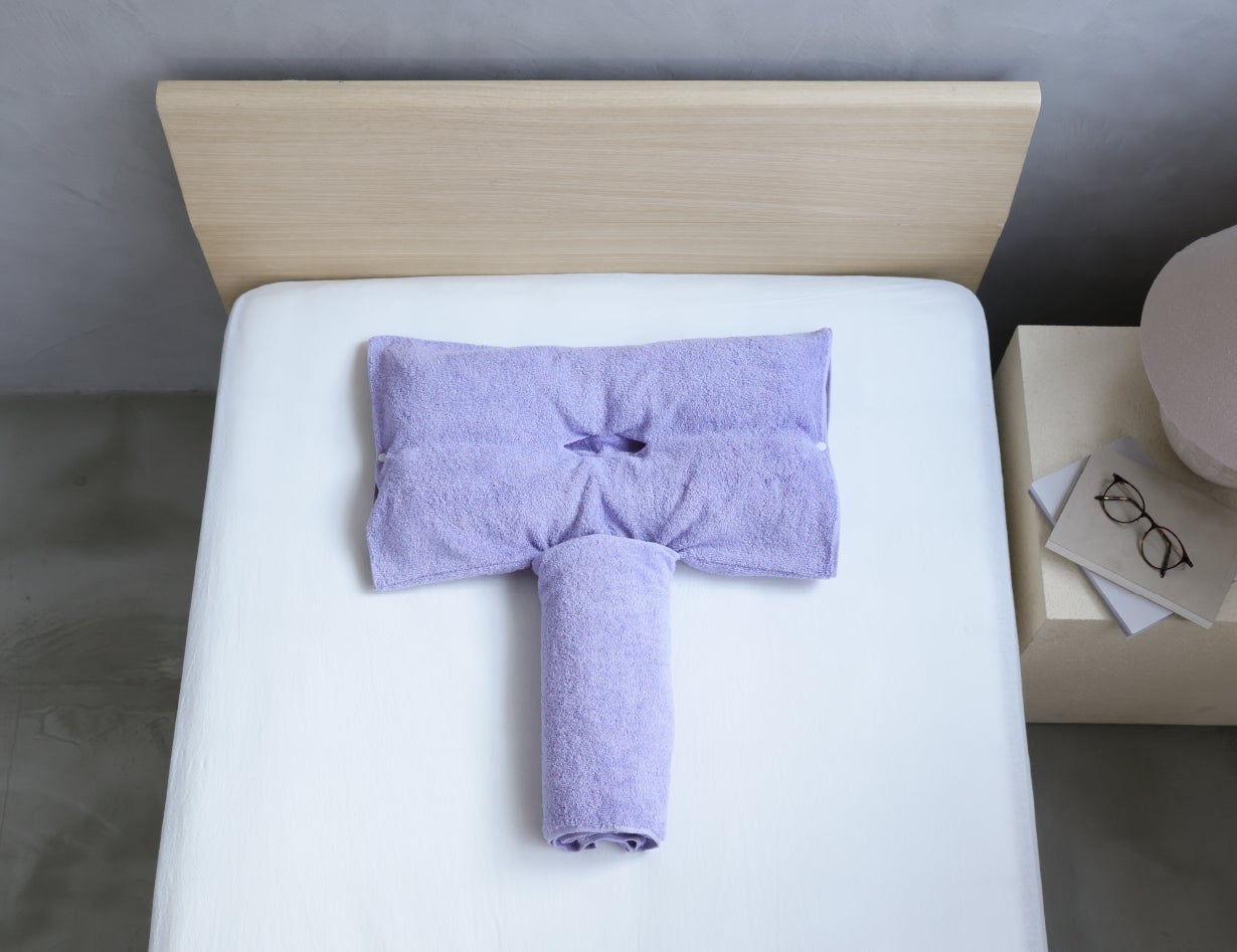 枕本体は頭を支え、首や肩へかかる圧力を分散させること、また枕自体の高さを簡単に変えるようにし、カバーはストレッチができる縦巻き、肩や背中への圧力を軽減する横巻きの2パターンで使えるように設計しました。