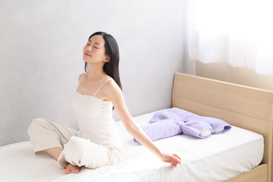 頭を支えて胸をひらくことで、肩甲骨を正しい位置へ導き、深い呼吸がしやすい姿勢で寝始めることができます。