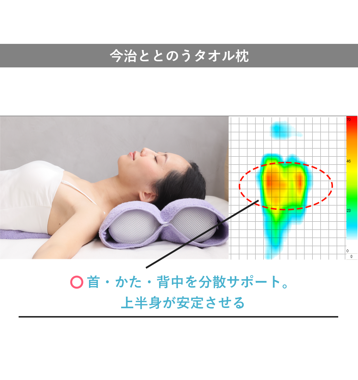 また、寝姿勢は頭と、肩に圧力がかかることが多いですが、寝今治ととのうタオル枕は、首や肩にかかる圧力を分散し、圧力が頭や肩に集中することを防ぎます。