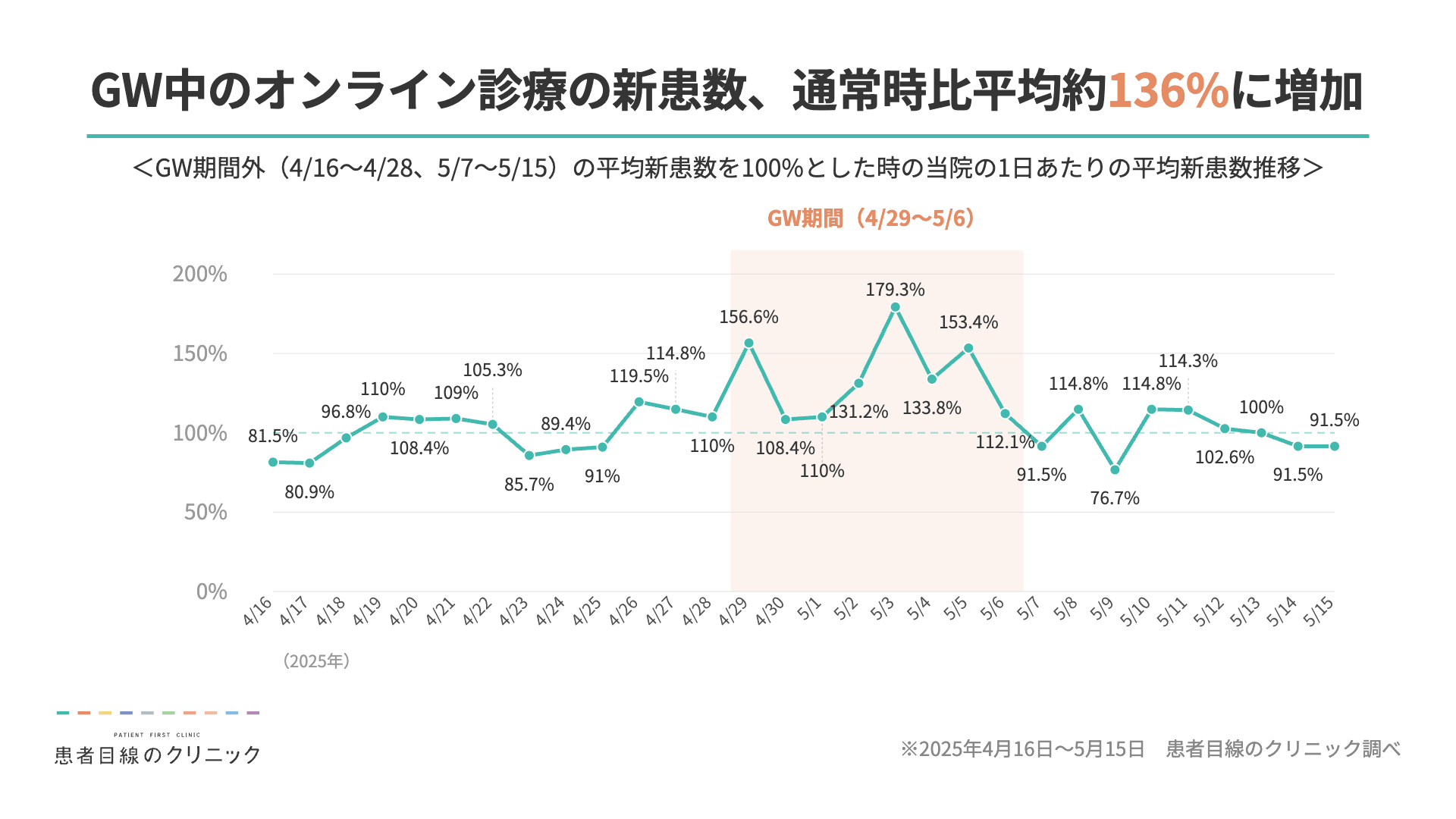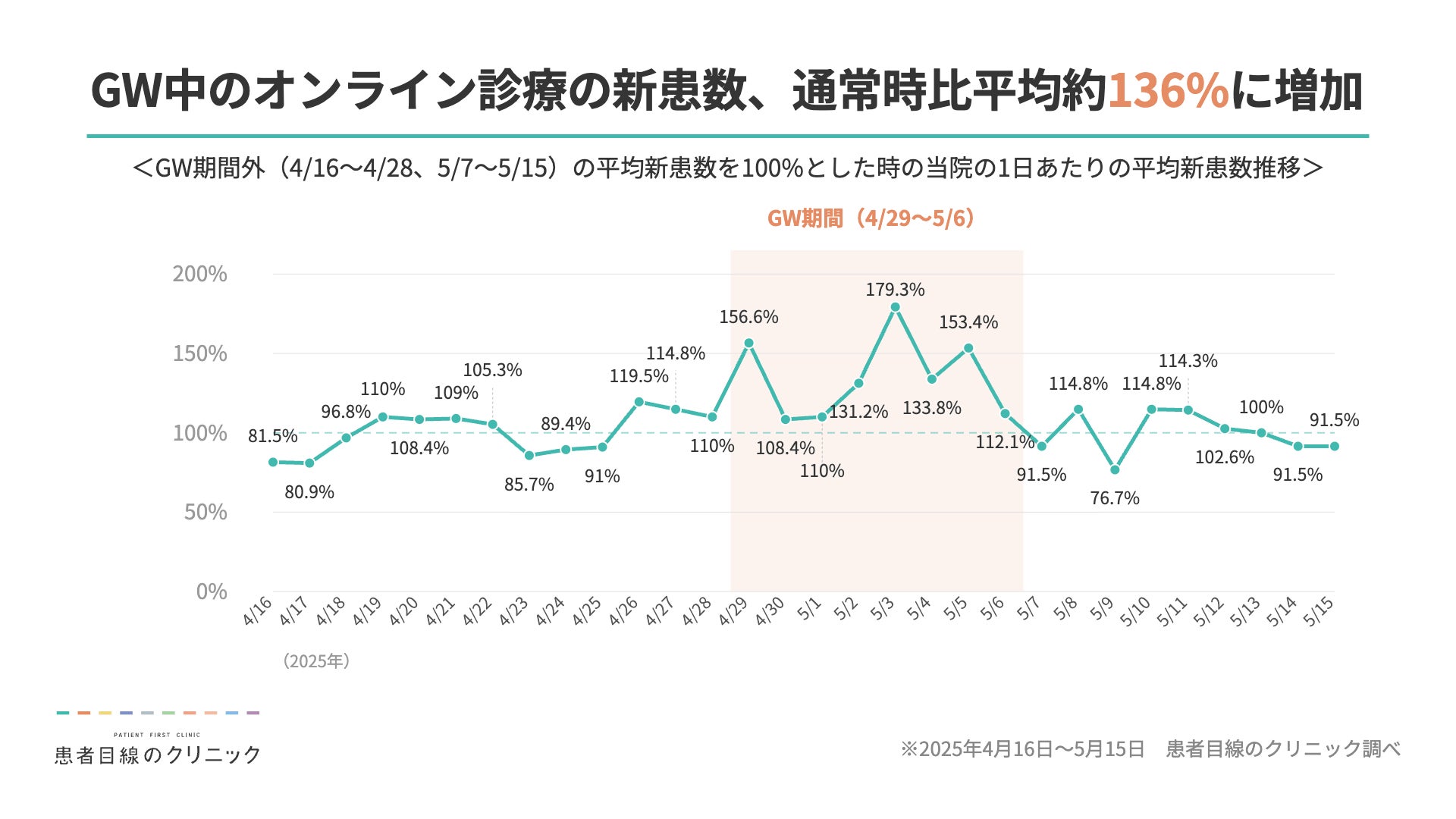昨年のゴールデンウィーク(GW)前後における当院の診療実績を分析したところ、1日あたりの平均新患数(※)において、GW期間中(4/29~5/6)は期間外に比べて平均約136%に増加していたことが判明しました。特に突発的な発熱等による内科受診の増加が目立ちます。連休中は普段とは異なる医療機関を探さざるを得ない「初診」の方の受け皿として、当院のようなオンライン診療の需要が高まった実態が浮き彫りとなりました。