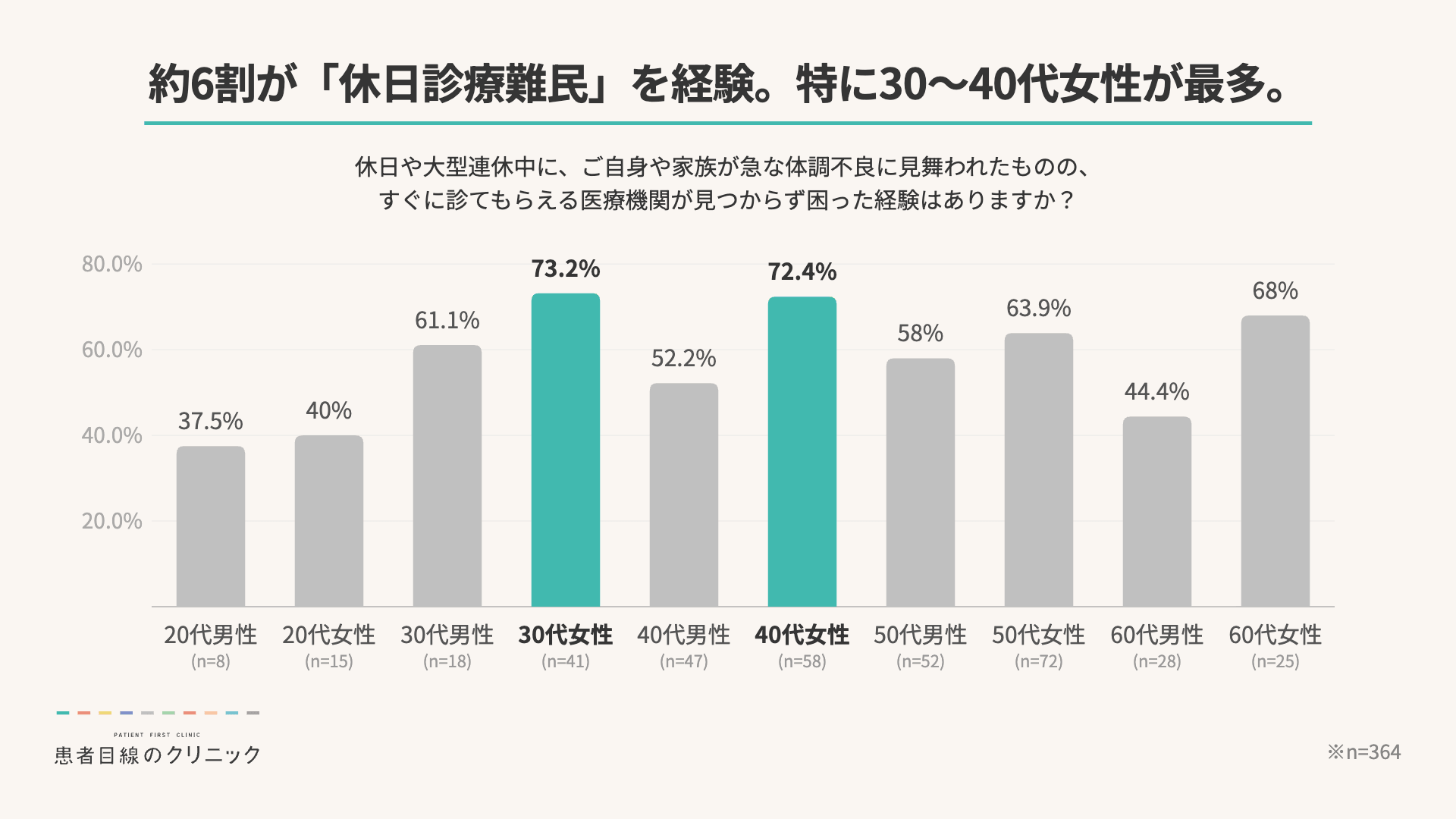 1.約6割の人が「休日診療難民」を経験。特に30~40代女性が最多。
