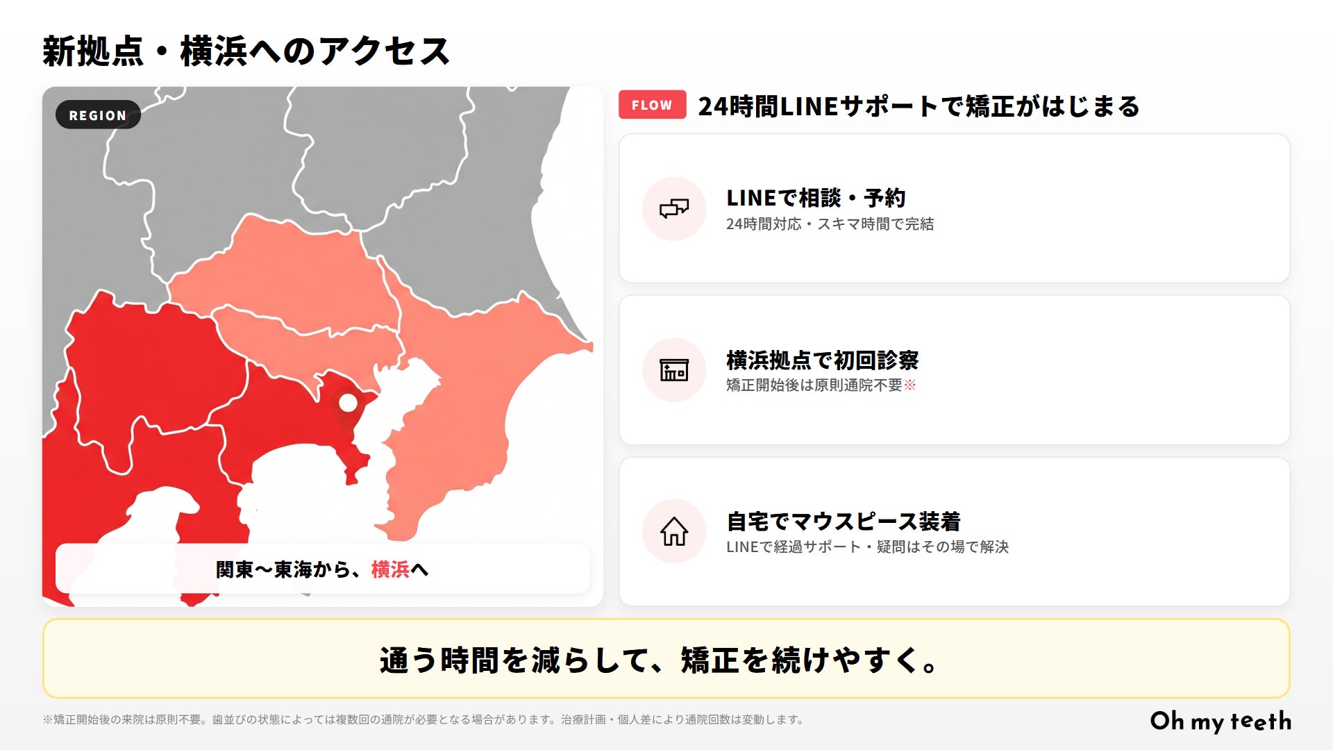 横浜の開院とあわせて、Oh my teeth が提供する24時間LINEサポート・通院最低1回の仕組みにより、神奈川エリアで矯正を始める際の負担を減らしていきます。※2