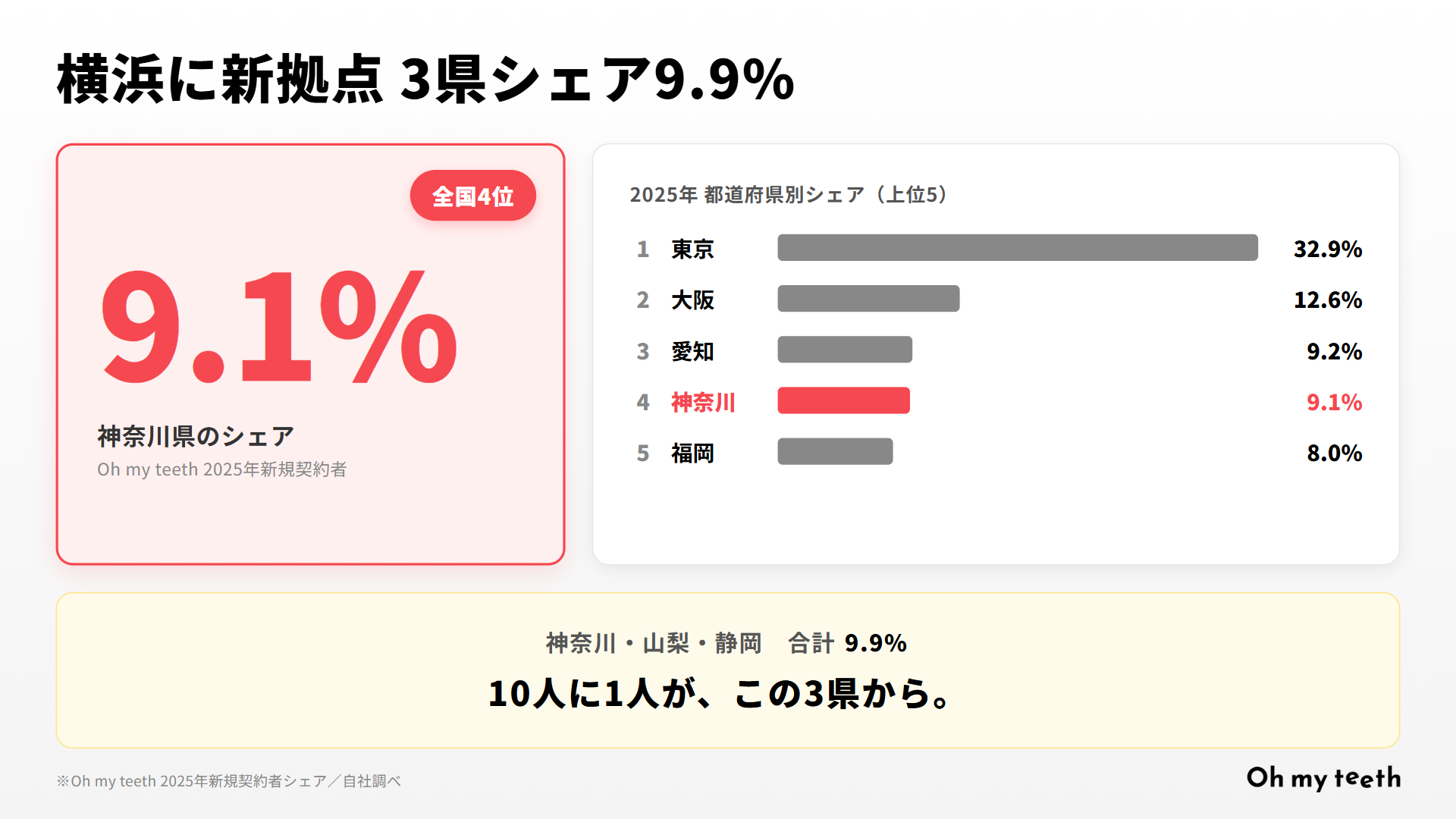 神奈川県は Oh my teeth の2025年新規契約者シェア9.1%で全国4位・首都圏では東京に次ぐ規模。24時間LINEサポート・通院最低1回のマウスピース矯正が全国12院目で利用可能に