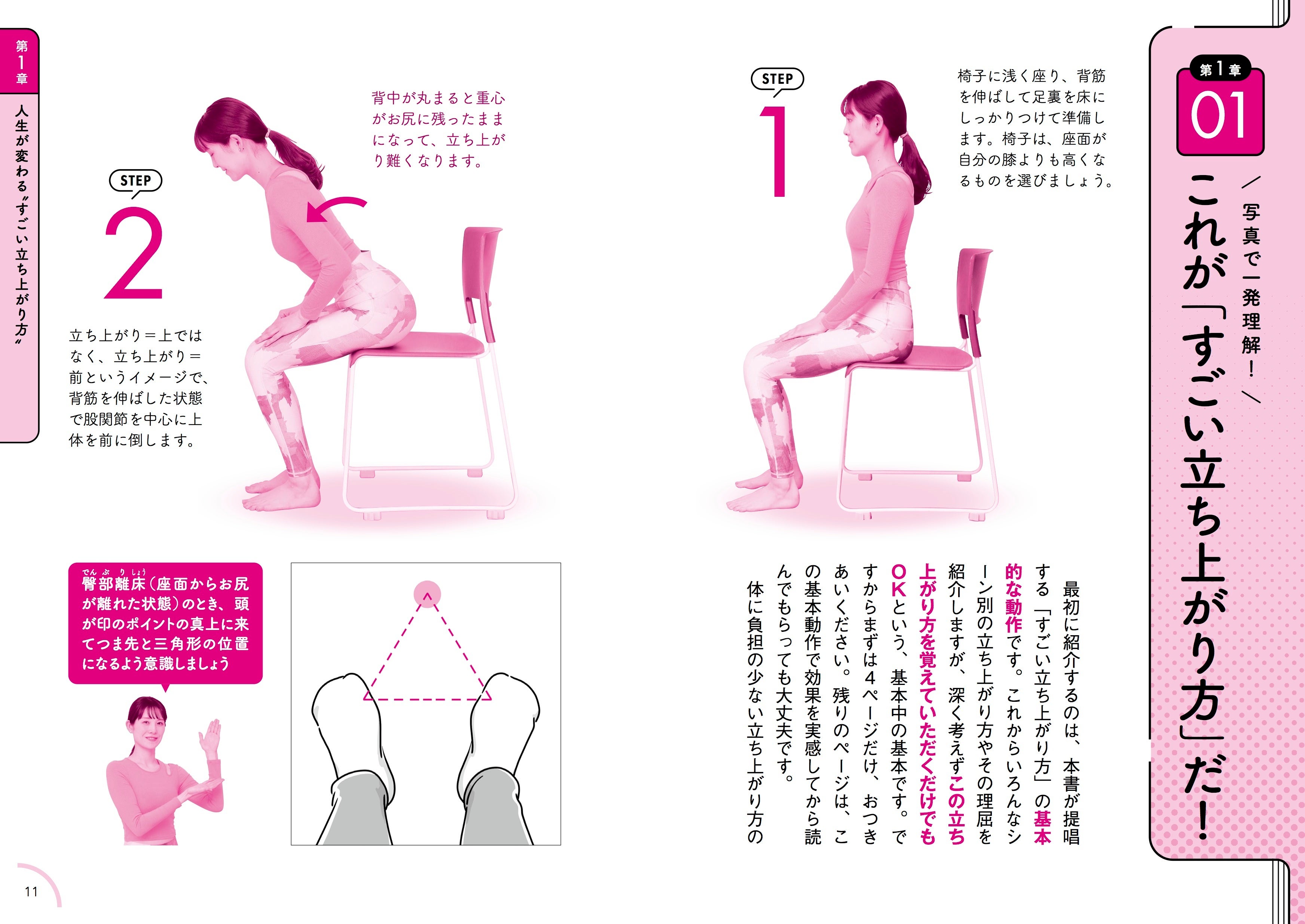 この2つのずれを引き落とす原因は柔軟性の低下であり、「背骨・股関節・太ももの裏が硬いと正しい前傾姿勢が取りにくくなり、その結果として誤った体の使い方が“習慣として固定”されてしまう」と小山田氏は指摘。そうならないための腰に負担を集中させない「すごい立ち上がり方」をわかりやすい写真入りでレクチャーします。