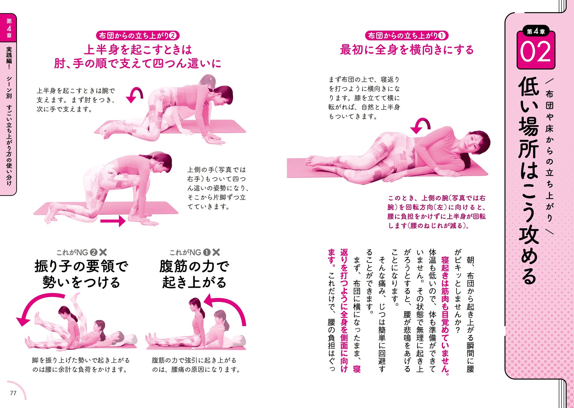 この本で紹介するのは、自宅でできるカンタンなエクササイズとセルフチェック、座り方や車からの降り方などの日常の基本動作で体を痛めないようにするコツです。