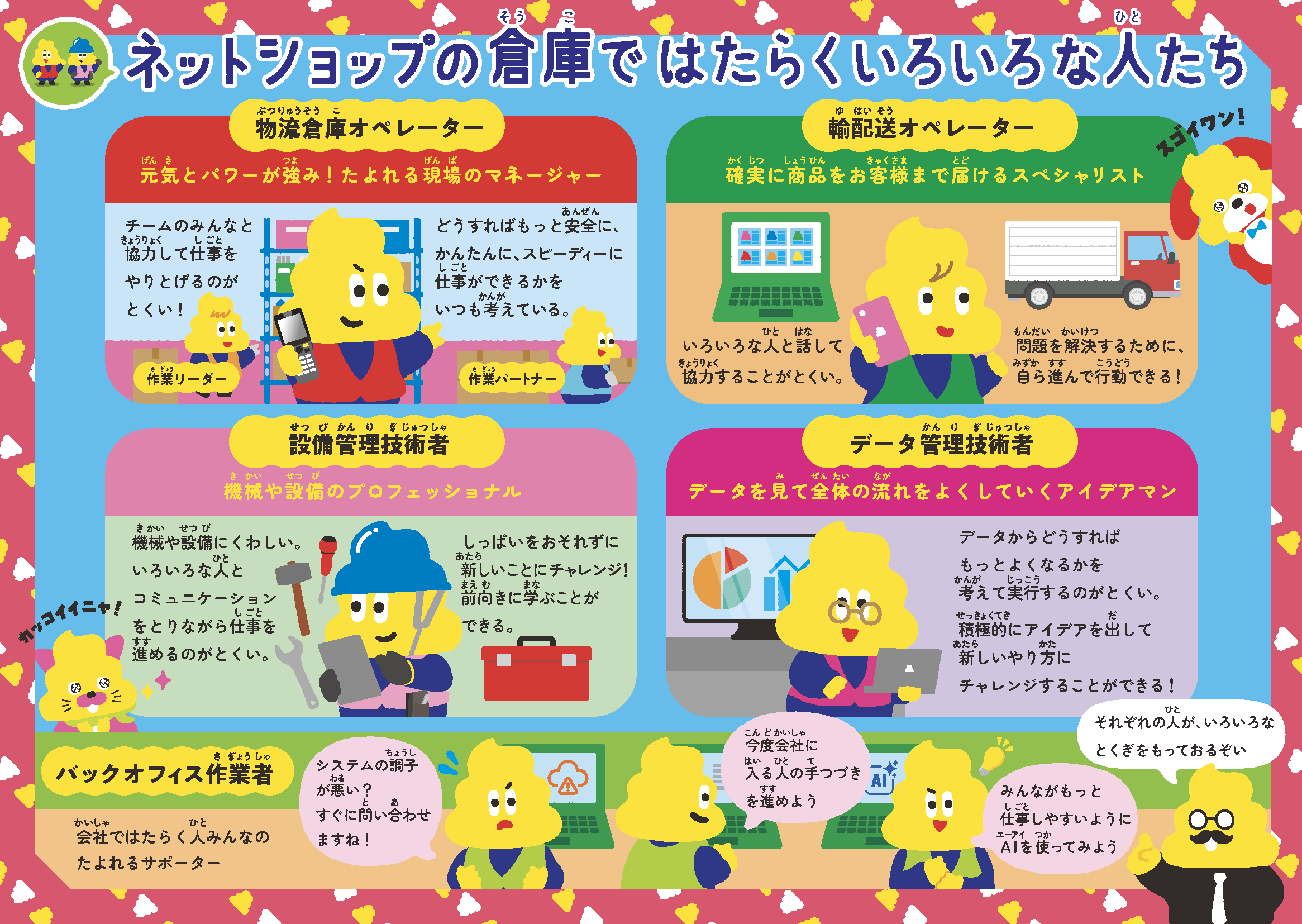 本冊子は、ネットショップで注文した商品がどのようにして届くのか、その裏側にある「倉庫」と「物流のしくみ」を、ユーモアたっぷりの物語とクイズ形式で紹介しています。