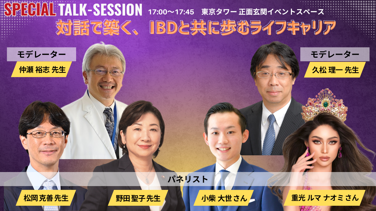 本イベントは産業界・行政・学術界・国政がそれぞれの立場を持ち寄りながら社会課題に向き合う、産官学国の協働としての意義も有しています。医療、教育、就労、社会制度の視点を横断しながら、IBDと共に生きる人が将来を諦めず、自分らしく力を発揮できる社会のあり方を発信します。