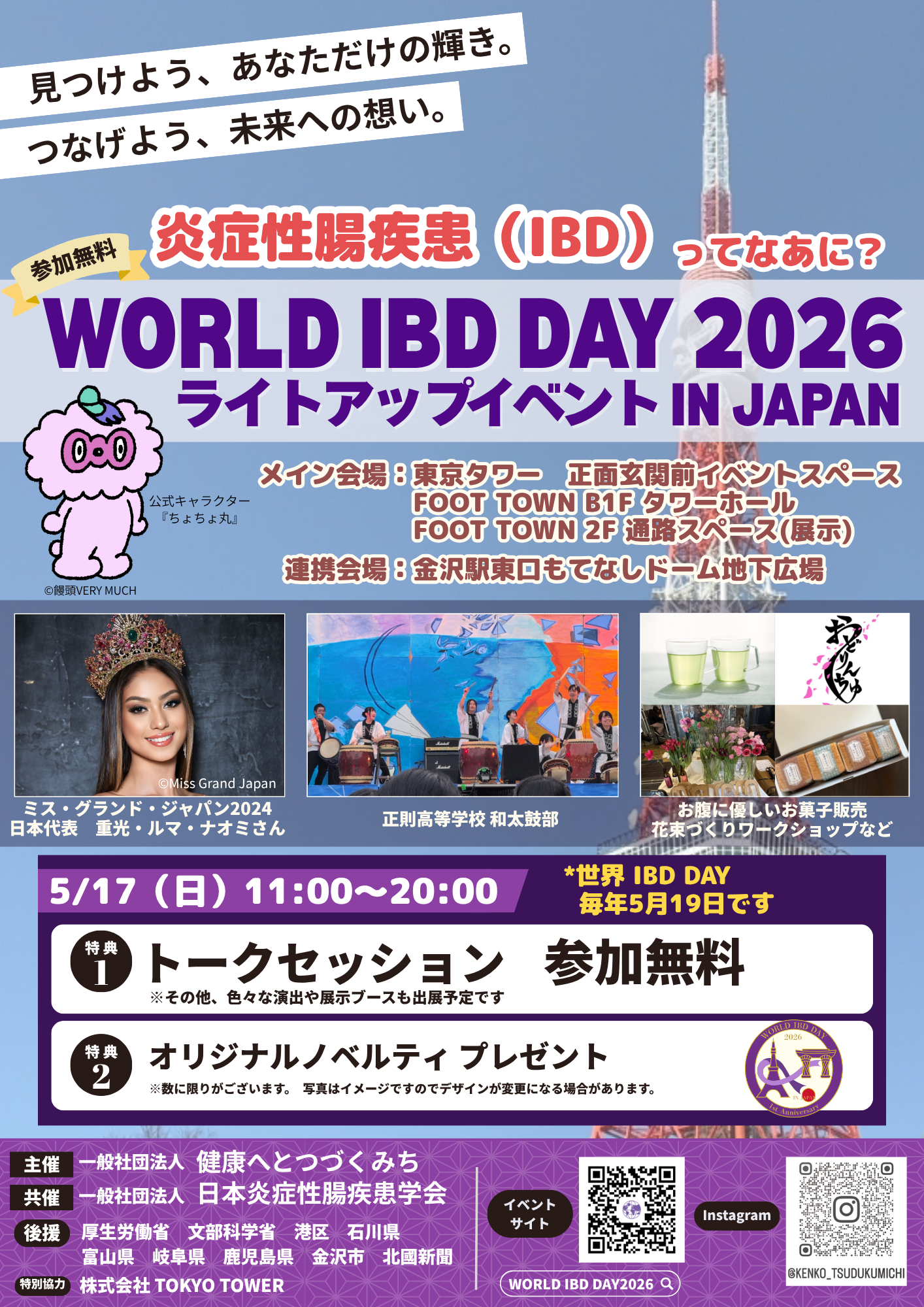 本イベントは、世界で制定されている啓発デー「World IBD Day」の趣旨にちなみ開催するもので、東京・金沢の二拠点でイベントを実施します。あわせてライトアップ企画は、東京会場における主催者発表としてIBD啓発として日本初となる東京タワーの紫色ライトアップを核に、金沢・岐阜・富山・鹿児島へと広がる多地域連動の啓発アクションとして展開予定です。