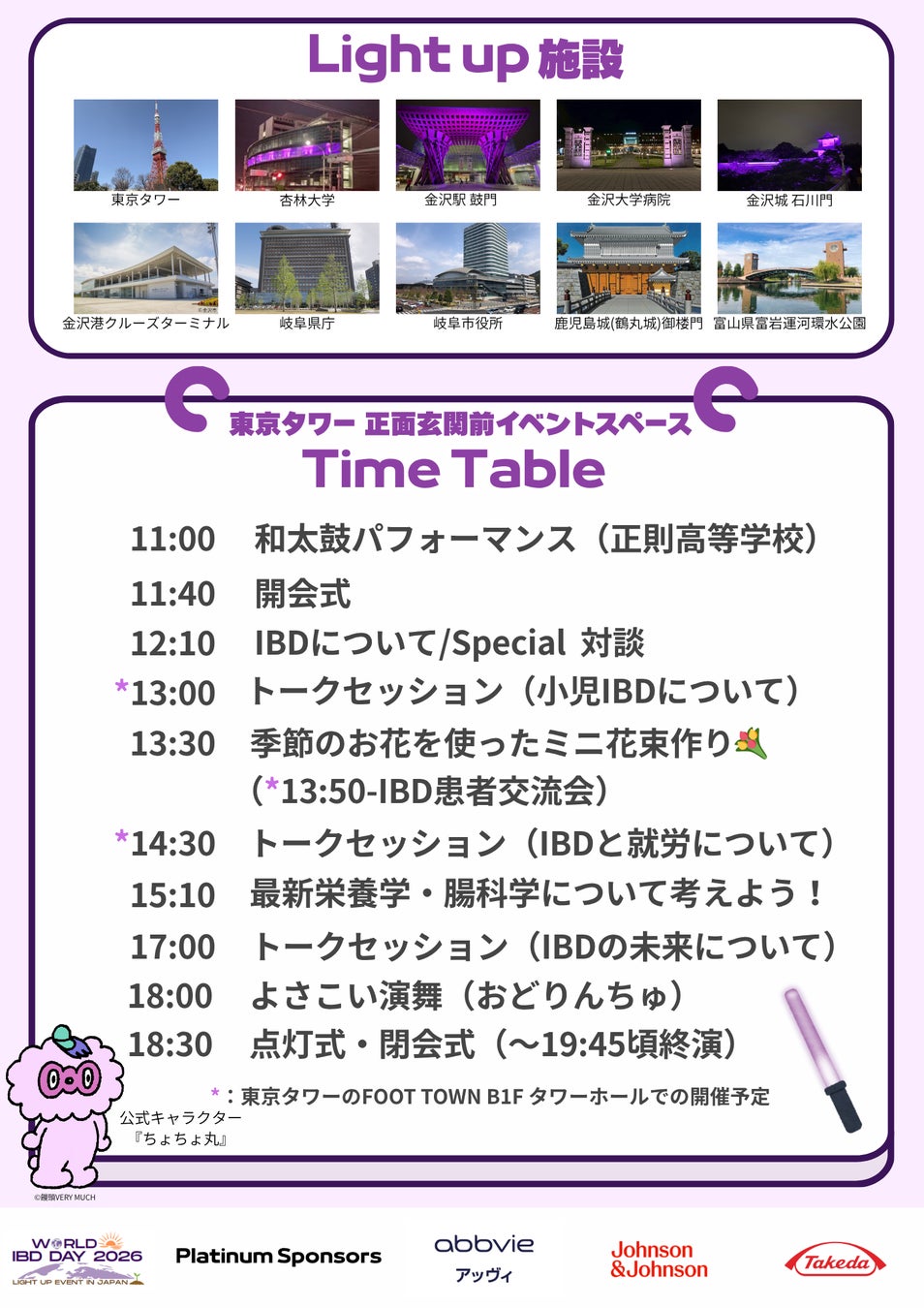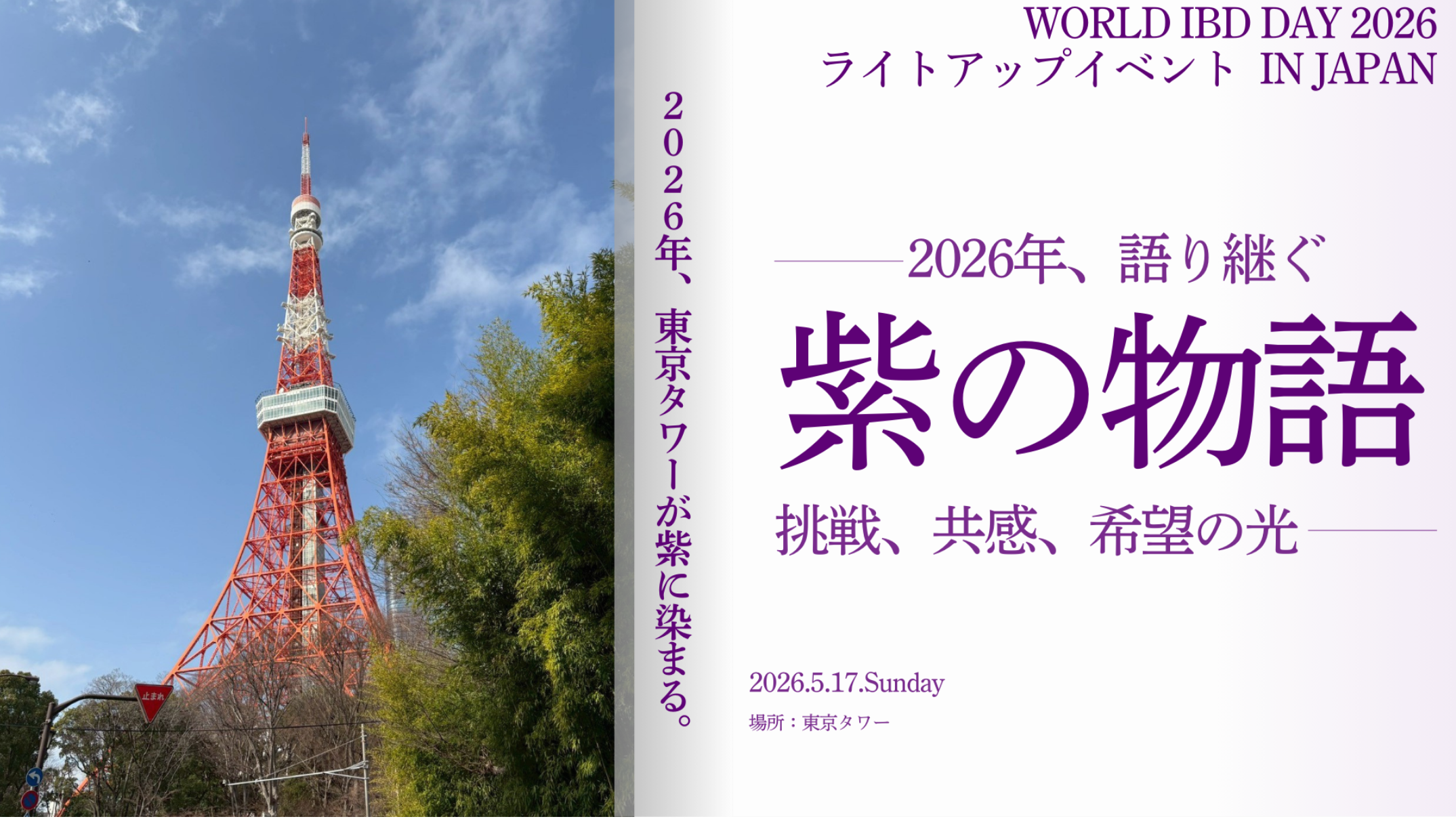 18:30からの点灯式・閉会式では野田聖子衆議院議員によるご挨拶を予定しており、東京タワーの紫色ライトアップとともに、IBDへの理解と連帯を象徴的に社会へ発信します。