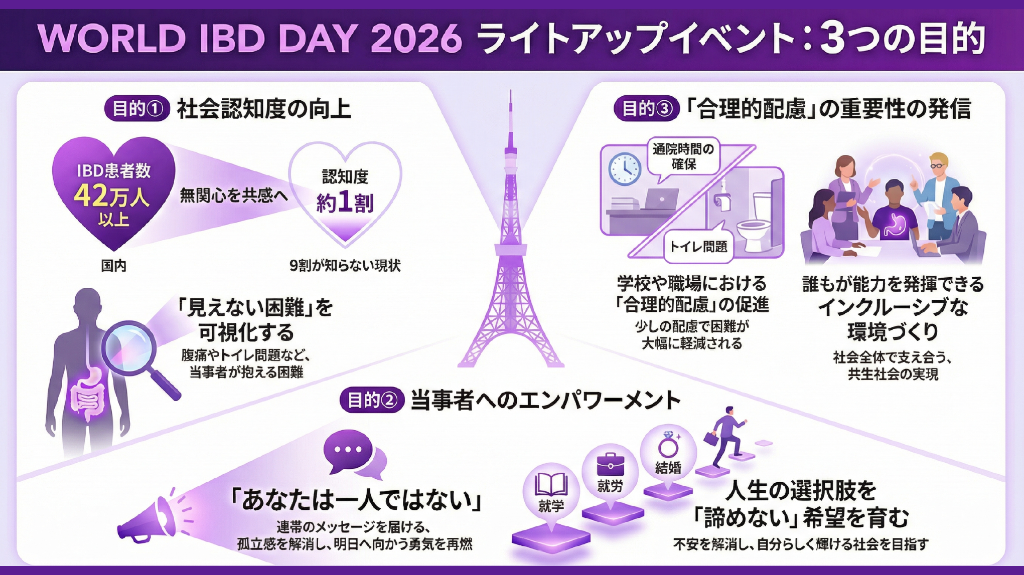 本プロジェクトが掲げるのは、その当たり前を社会の標準へ変えていくことです。東京タワーを照らす紫の光は、未来へのエールであると同時に、社会共創の出発点を示す光でもあります。