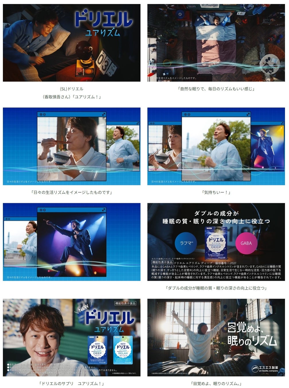 今回の新TVCMは、「ユアリズム新発売」をタイトルに、ドリエルのサプリ『ユアリズム』を取り入れる生活シーンを通じて、良い眠りがもたらす心地よい毎日のリズムをイメージとして描いています。CMキャラクターには、歌手・俳優・アーティストなど、多彩な分野で活躍する香取慎吾さんを起用。ベッドに入り、眠りにつく夜の姿から、朝のすっきりとした目覚め、さらにアクティブな日中のシーンへと展開することで、良い眠りが日々のリズムとコンディションを支え、毎日を前向きにしてくれることを表現しています。睡眠の質に目を向けるきっかけを感じさせる、香取さんのやわらかな表情にもご注目ください。