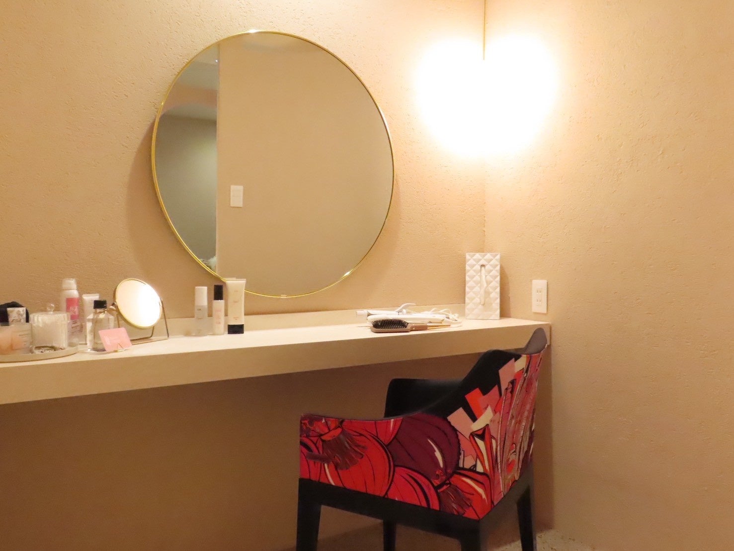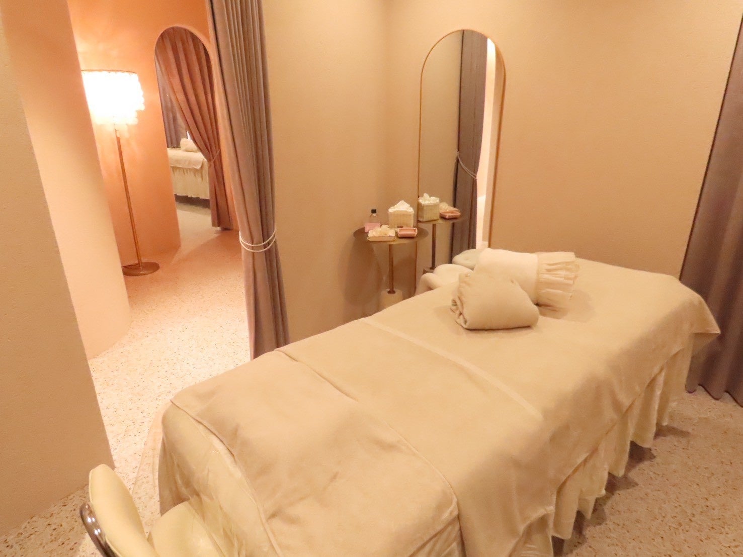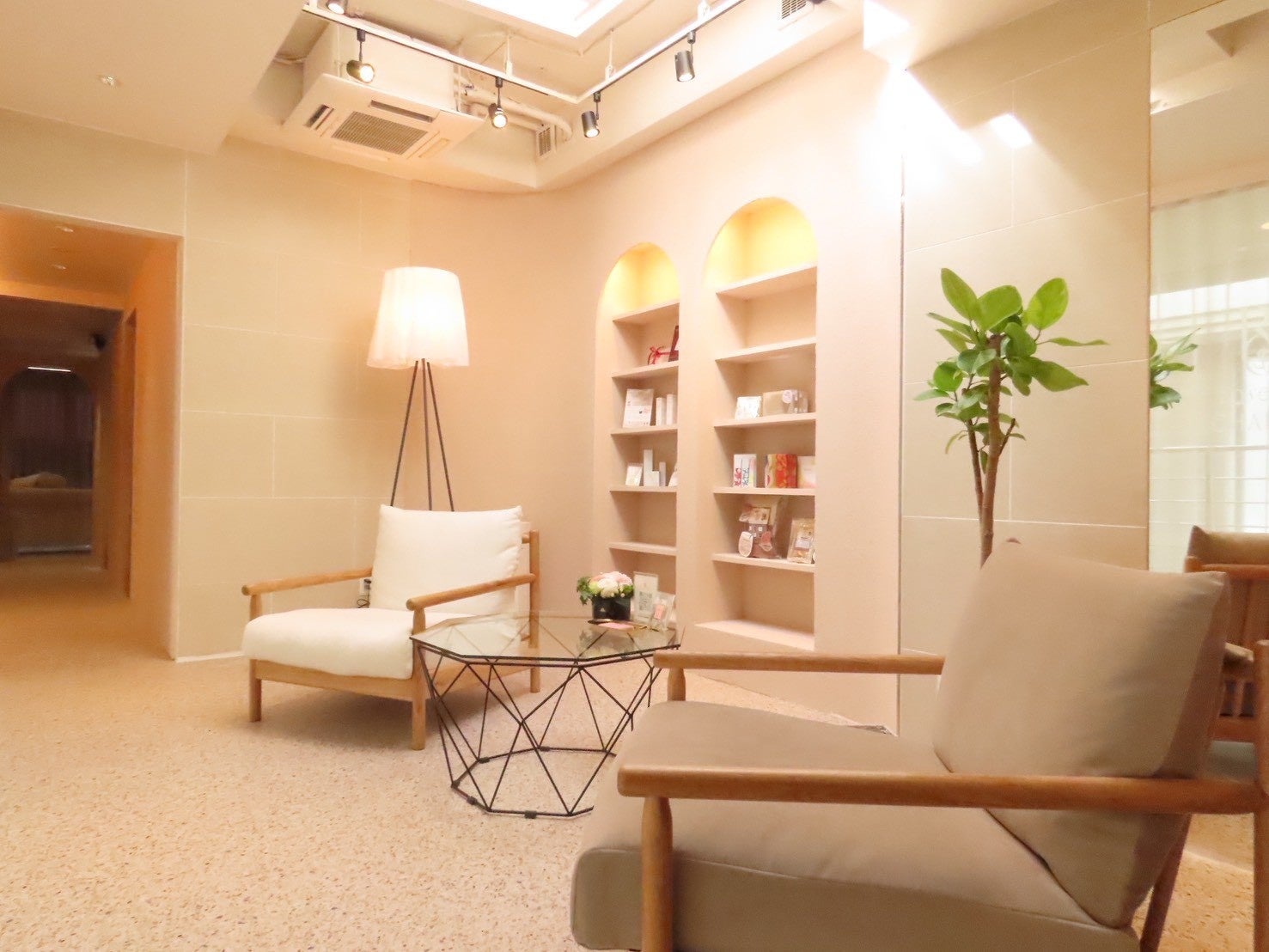 店内は、一般的なクロス仕上げではなく、壁全面を左官仕上げの塗り壁で統一。意匠性に加え、調湿や消臭といった機能面も意識しています。空間全体は白を基調とした無機質な雰囲気ではなく、薄いピンクベージュを中心にまとめたやわらかな色調で構成。待合スペースもゆったりと確保し、ラウンジチェアを配置することで、施術前後も落ち着いて過ごせる空間に仕上げました。