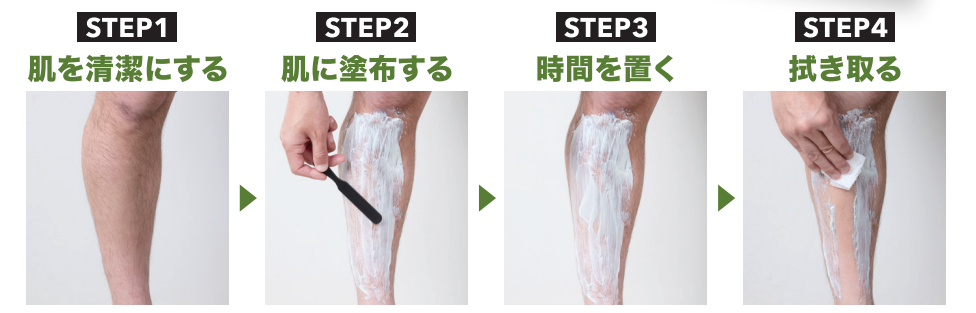 除毛する部分を洗い流すか、濡れタオルで拭く。その後、水分はしっかり拭き取る。