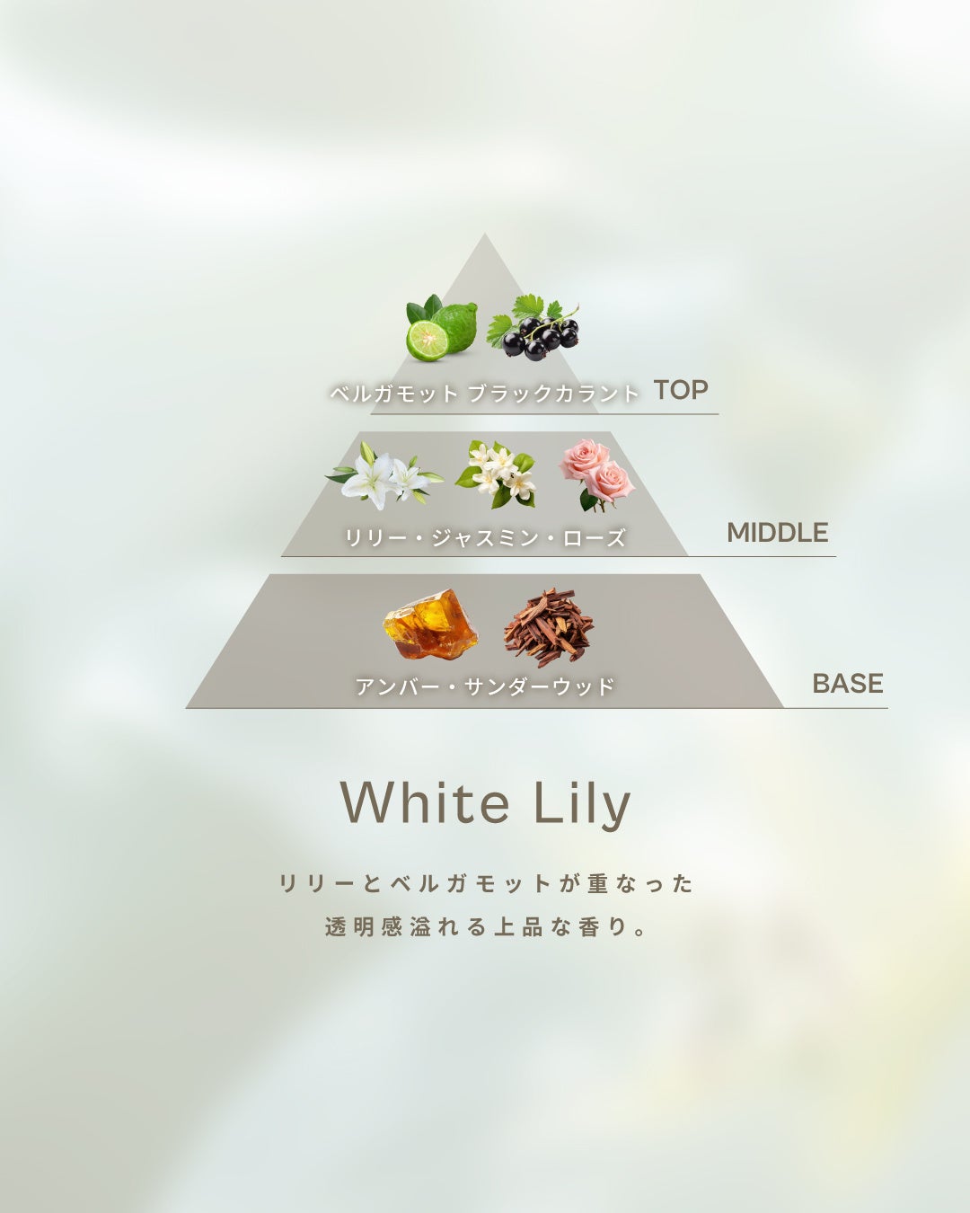 みずみずしいベルガモットやグリーンが軽やかに広がるトップノートから、ホワイトリリーやジャスミン、マグノリアが重なる上品なミドルノートへ。ラストはムスクとサンダルウッドがやさしく残り、あたたかみのある余韻へと続きます。