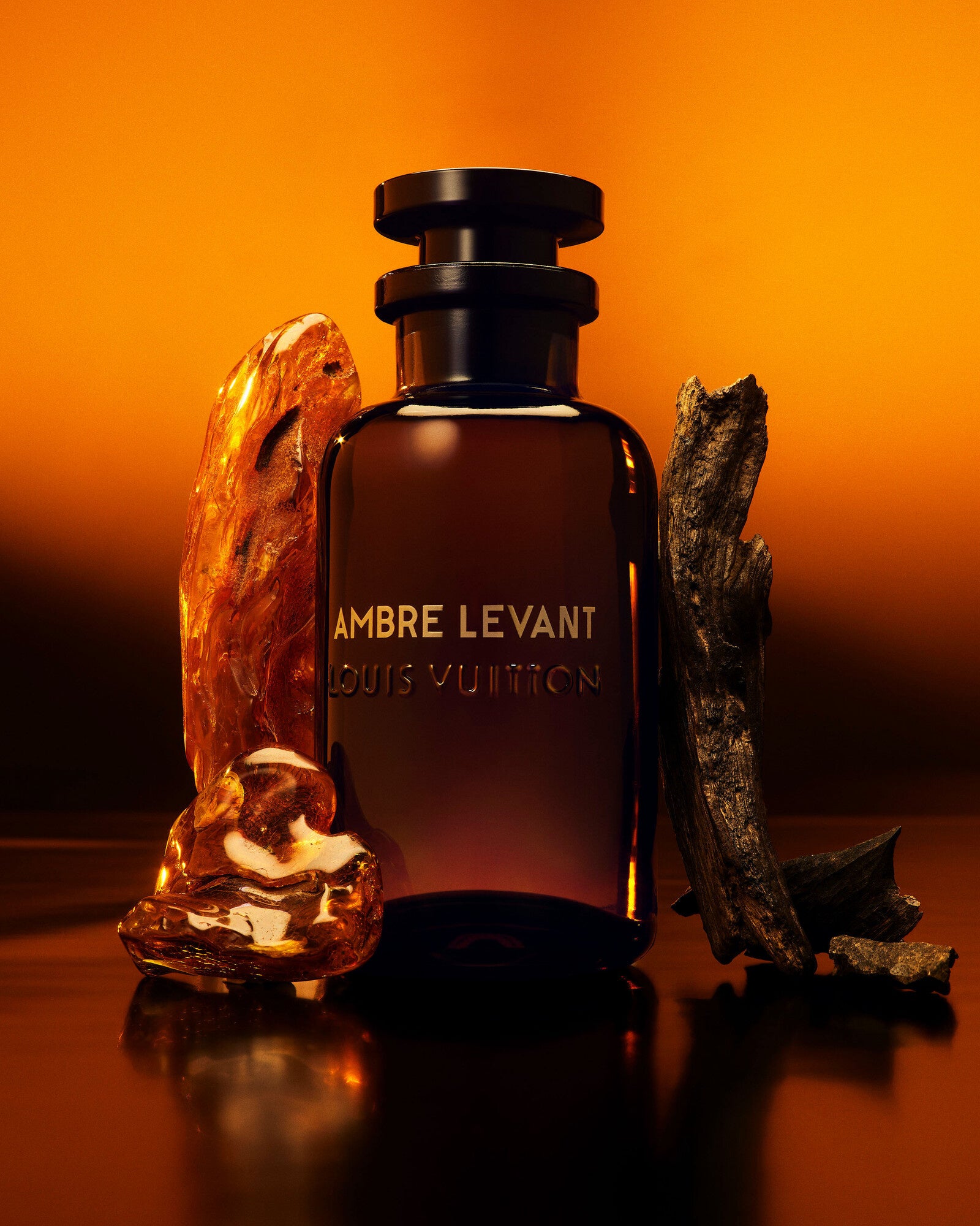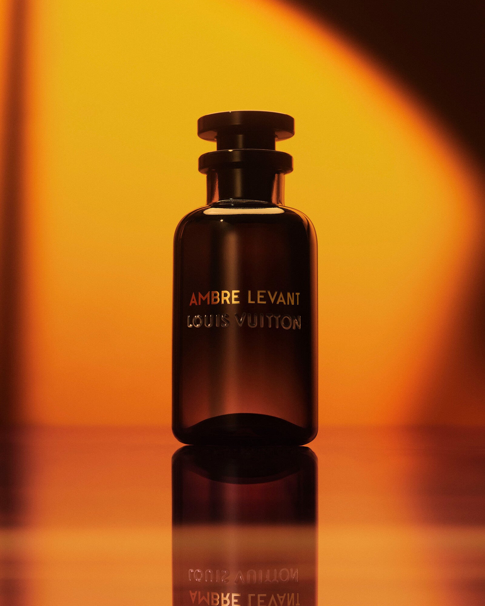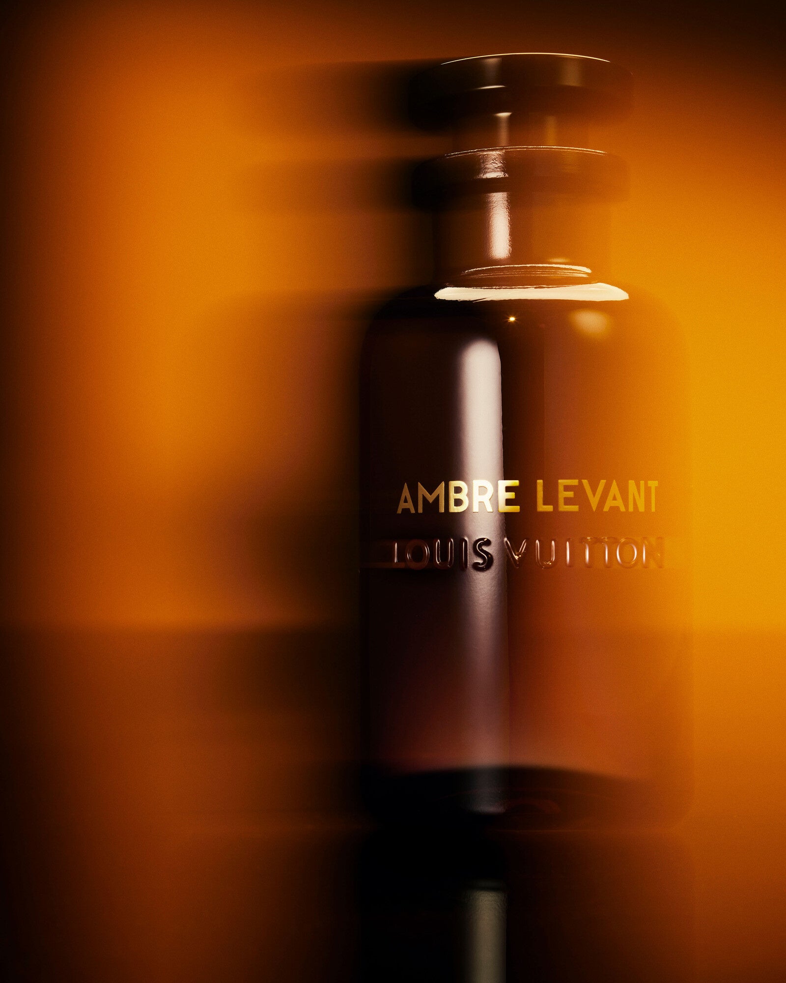 透明感のあるブラックガラスで仕上げられたルイ·ヴィトンのアイコニックなフラコンが、深く暖かみのある琥珀色に染まります。それはまるで、ゴールデンアワーの輝きがガラスの内側から放たれているかのよう。