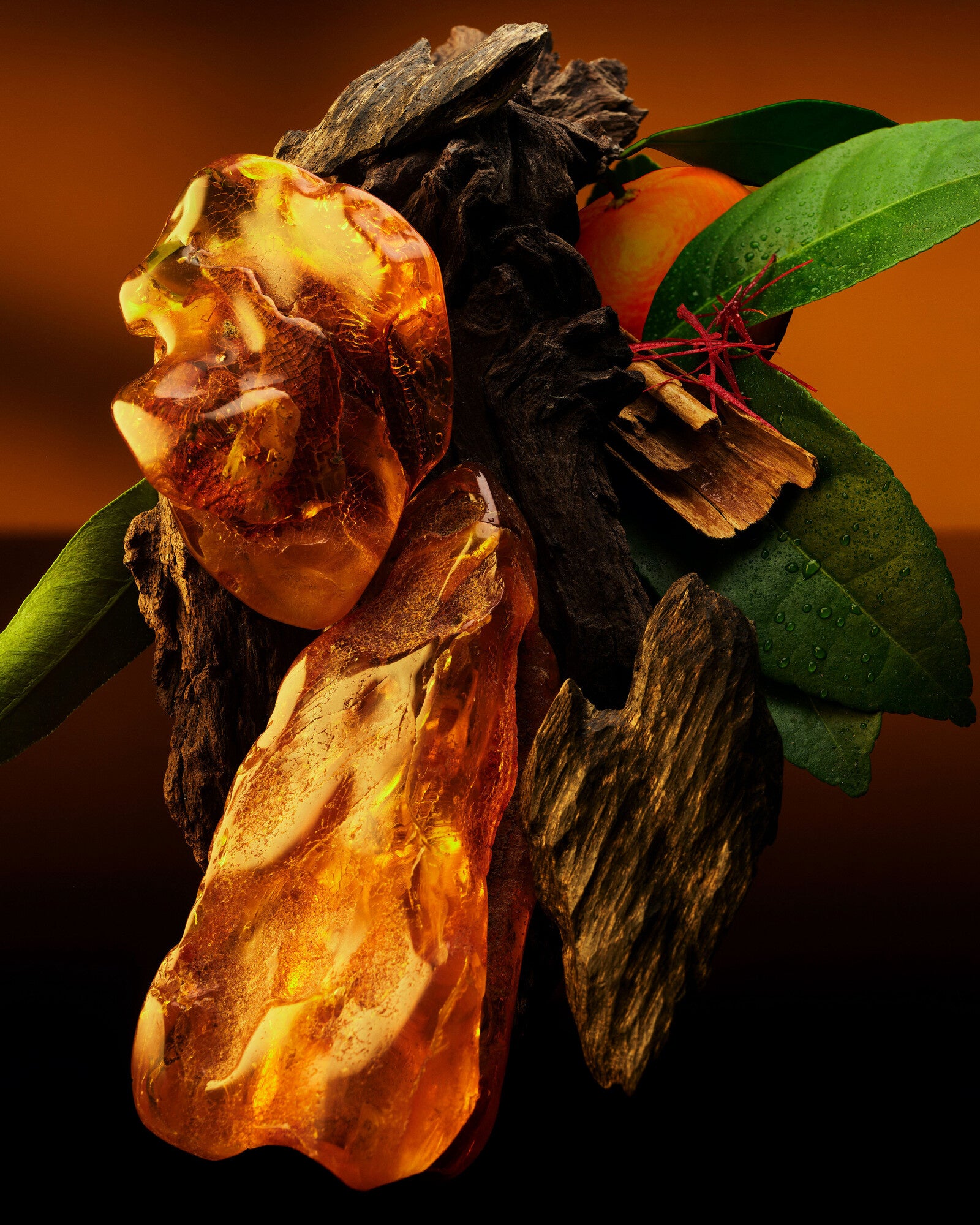 ブラックゴールドと呼ばれるウードは、中東における香水文化を象徴する宝であり、コンポジションの深みと力強さを幾重にも増幅させます。それは、ジャック·キャヴァリエ·ベルトリュードにとって、比類なき官能性を湛えた香木の1つです。「これは、唯一無二の存在であり、卓越した品質を備えている。類い稀な洗練を湛えたそのウッディな個性は、非常に繊細なアニマリティと、スパイシーでありながらアンバーを想わせるエレガンスを醸し出す」。アンバーを象徴的なシグネチャーとする「アンブル·ルバン」は、ゴールデンアワーの光を引き出し、その輝きを肌の上へと広げます。