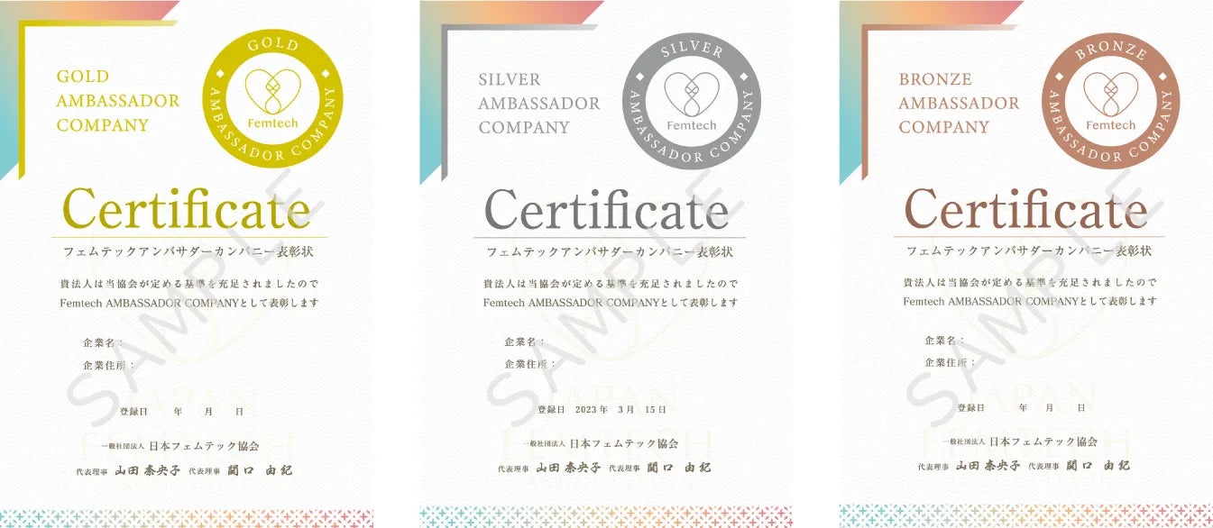 フェムテックアンバサダーカンパニーでは、社員数と認定資格3級合格者の割合(普及率)に応じて、「GOLD」「SILVER」「BRONZE」の3つのランクで表彰します。単発の施策で終わらせるのではなく、毎年ステップアップしたランクを目指すことで、組織のリテラシー普及率を可視化し、社内の相互理解を深める指標として活用できます。「どこまで踏み込んでよいのか分からない」といった現場の声が多い中、まずは正しい基礎知識を“組織の共通言語”にすることで、