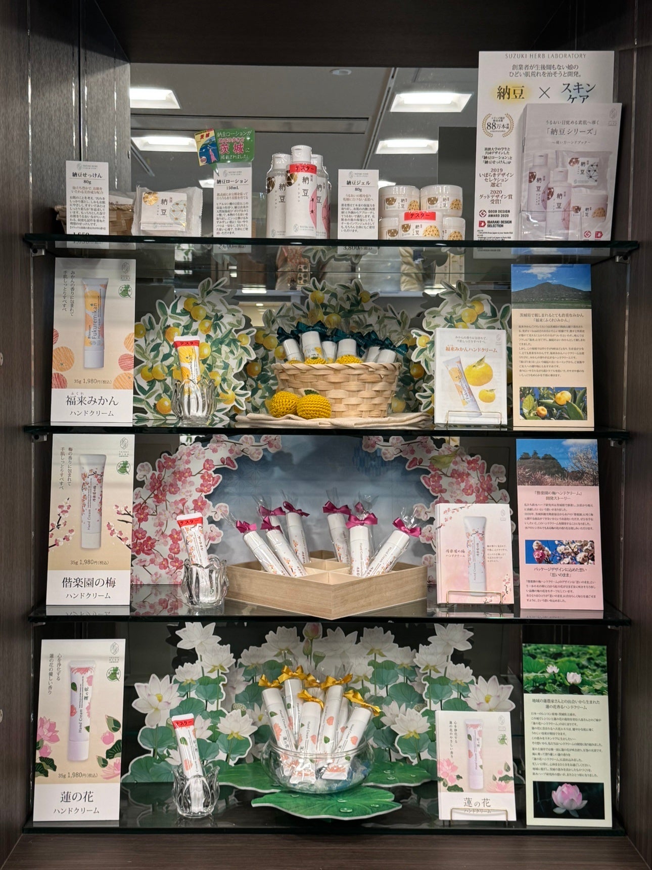 茨城県東海村を拠点とする株式会社鈴木ハーブ研究所は、県の魅力を多くの方に知っていただきたいという想いから、茨城県の特産品を活かしたご当地コスメを開発し、自社WEBサイトや茨城県アンテナショップ、茨城空港、道の駅などで販売しています。今回新たに、アートホテル鹿島セントラル内「SONIA COFFEE」で「偕楽園の梅ハンドクリーム」「福来みかんハンドクリーム」「蓮の花ハンドクリーム」「納豆ローション」「納豆ジェル」「納豆せっけん」の6商品が取り扱い開始となりました。