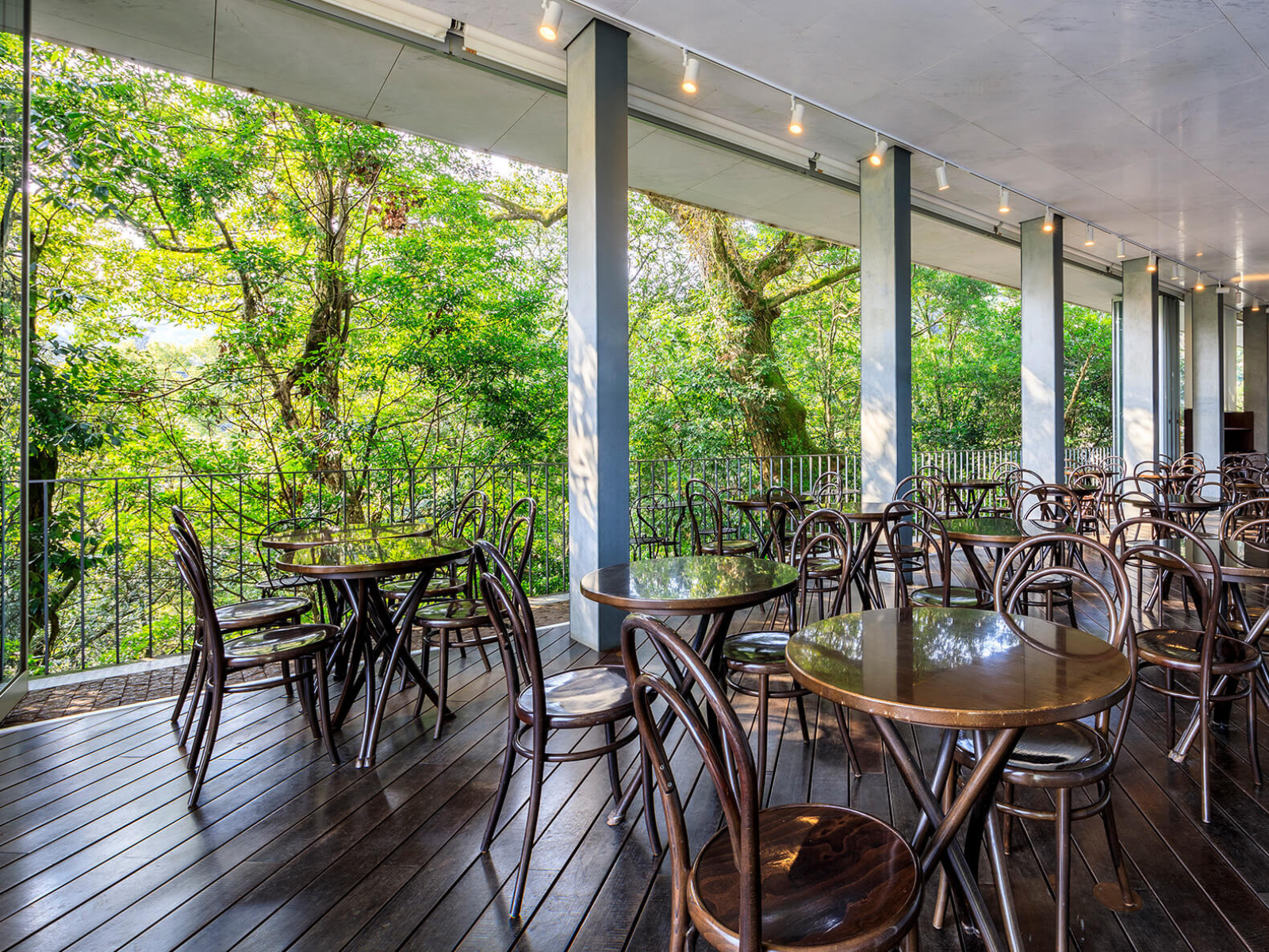 かつて参詣者のための休憩所として親しまれてきたこの地は、現在では自然に包まれたカフェ&レストランとして、訪れる人々に静かで豊かな時間をもたらしています。店内に足を踏み入れると、空間いっぱいに広がる青一色のヤブツバキの陶板画が印象的に迎え、外へと続くテラスでは、神域の澄んだ空気とともに過ごすひとときが広がります。神椿は金刀比羅宮という特別な場所に流れる時間や余韻を、より深く味わうための空間として、多くの人に親しまれています。
