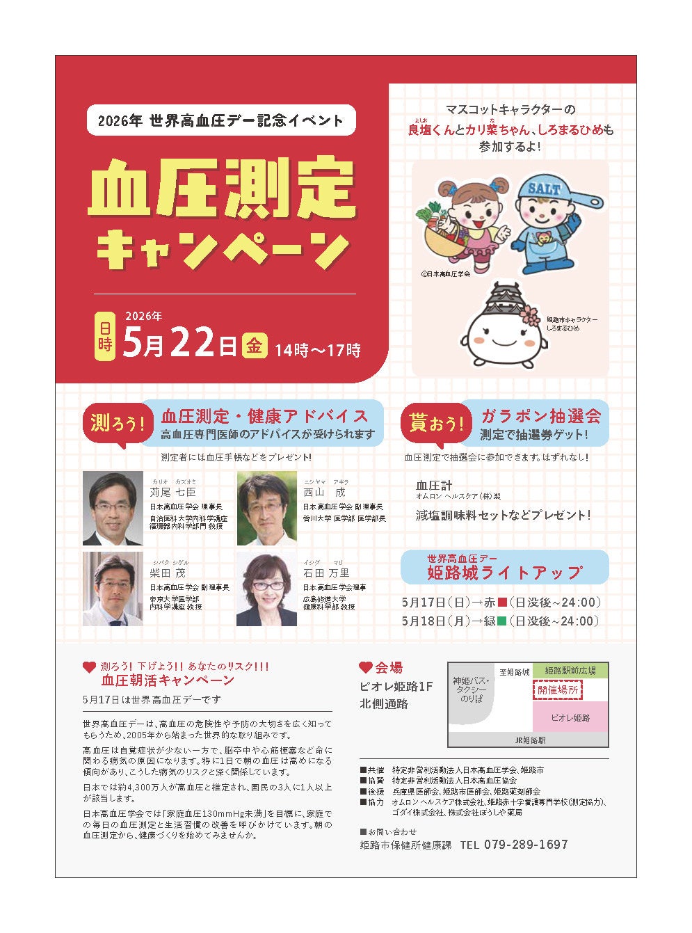 健康的な生活における血圧測定の重要性を知ってもらうことを目的に、イベントが開催されます。無料での血圧測定や高血圧専門医師のアドバイスコーナー、ガラポン抽選会を行います。