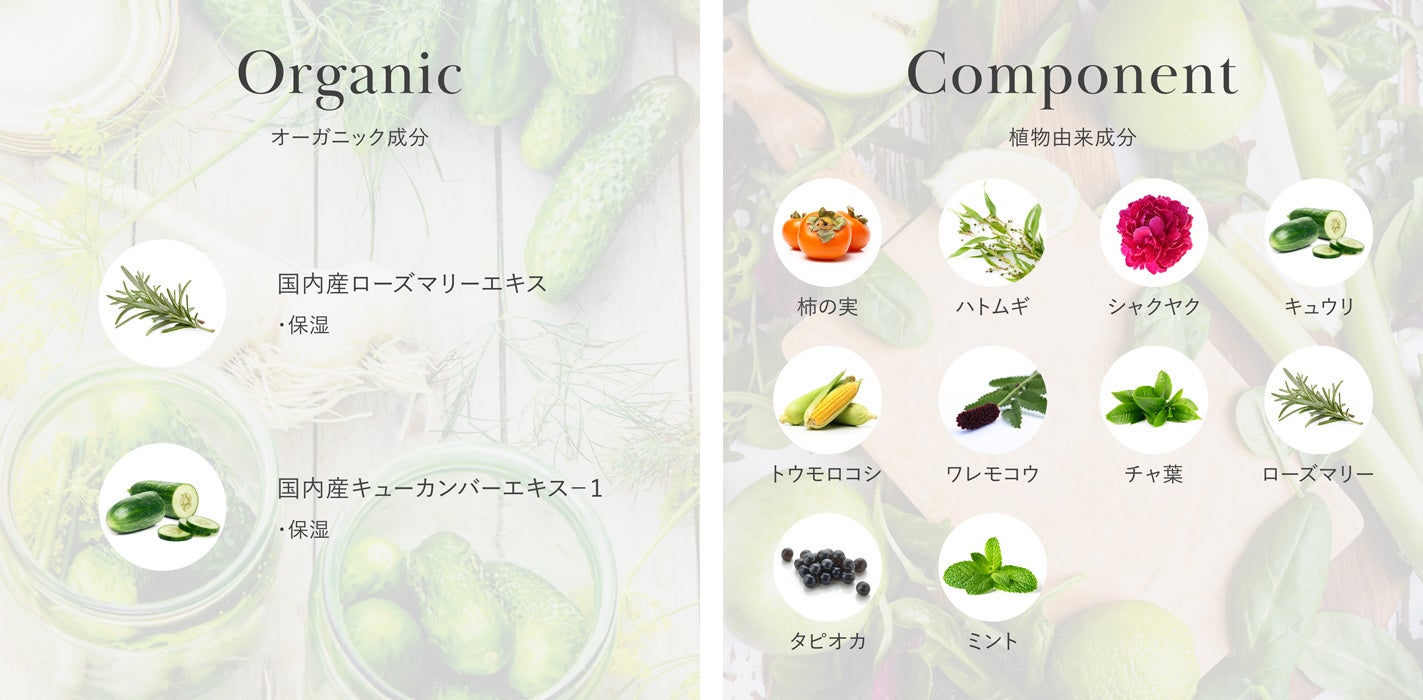 2種の国産オーガニック成分含む10種の植物由来成分配合で、お肌にやさしいナチュラル仕様にこだわりました。