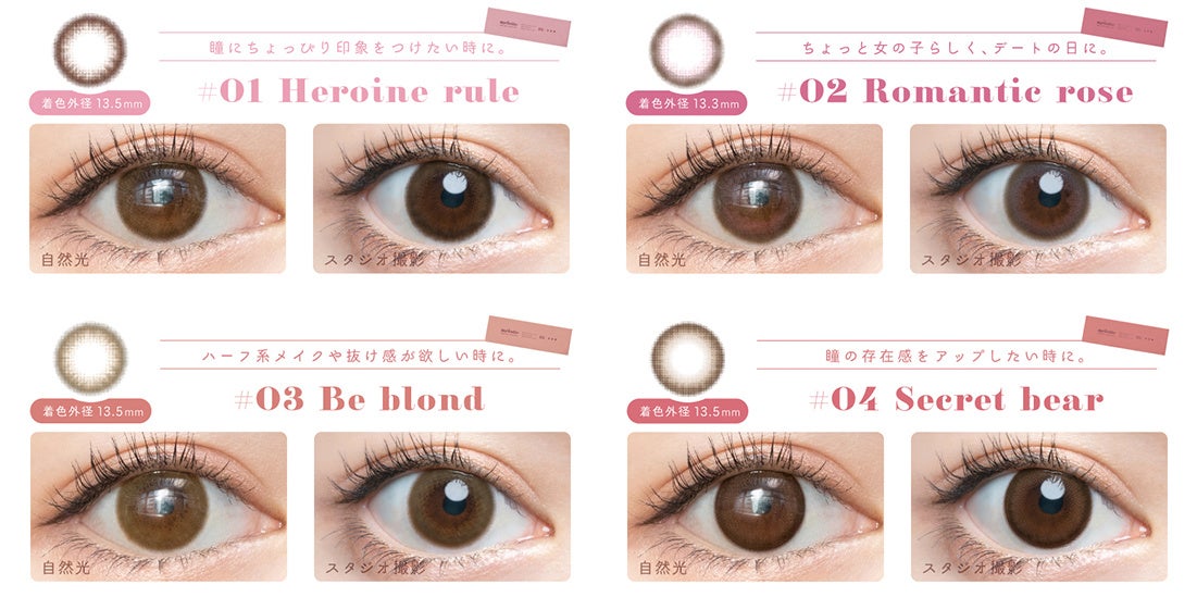 自然光も室内も可愛く見えるレンズデザインと、カラー毎で異なるパッケージデザインにも注目です。