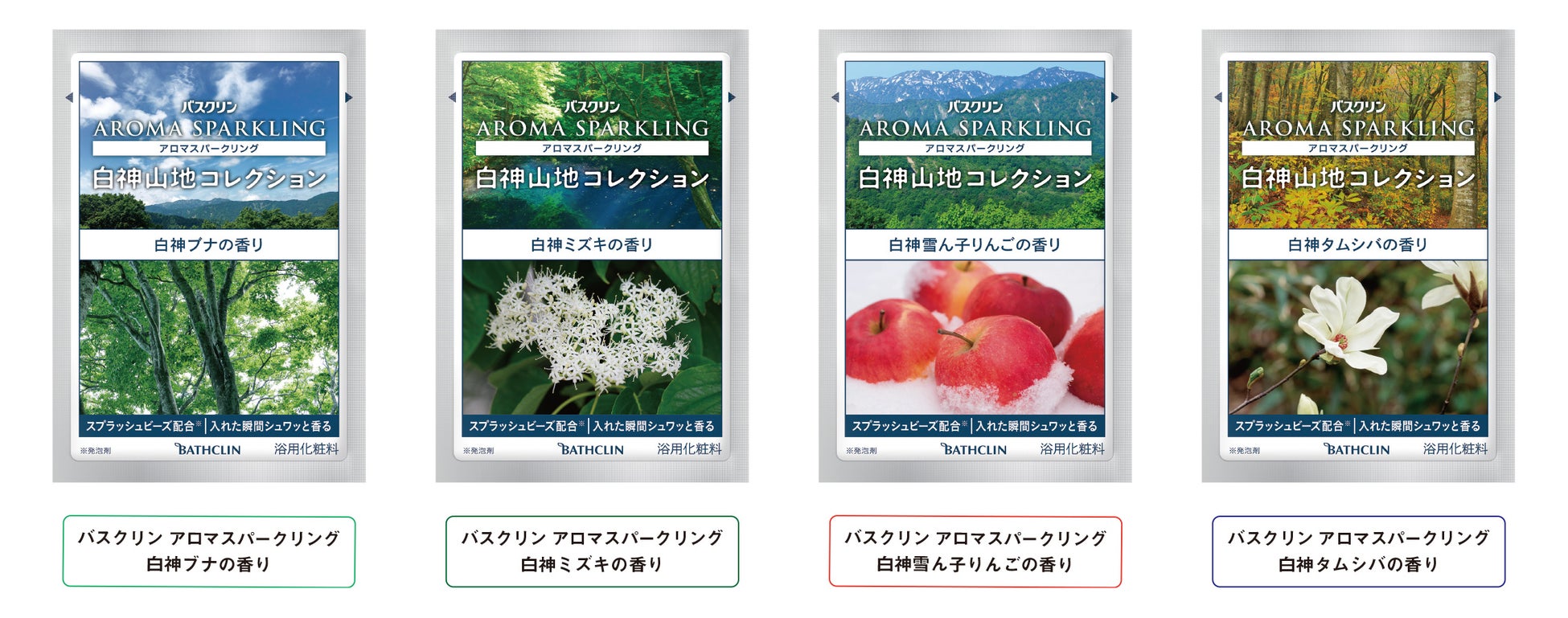 株式会社バスクリン(本社:東京都千代田区 社長:三枚堂正悟)は、「スプラッシュビーズ®」(発泡剤)の瞬間発泡により、香りがはじけて広がり、全身で香りを楽しめる入浴料「バスクリン アロマスパークリング」シリーズから、世界遺産「白神山地」へ行った気分を日替わりで楽しめるアソートタイプの入浴料「バスクリン アロマスパークリング 白神山地コレクション」を3月7日(月曜日)に新発売いたします。