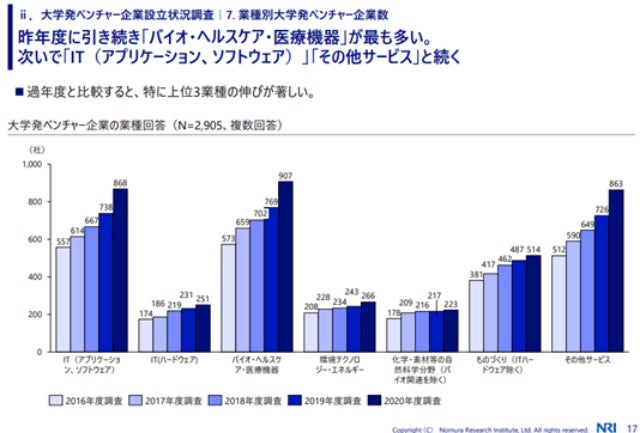 それらを背景に、大手企業を含めて多くの企業がヘルスケア領域へ参入しており、ヘルスケアに関連したベンチャー企業も多数設立されました。経済産業省が発表する「令和2年度大学発ベンチャー企業実態調査」でも、バイオ・ヘルスケア・医療機器のベンチャー企業設立数が907件と最も多かったと報告されています。