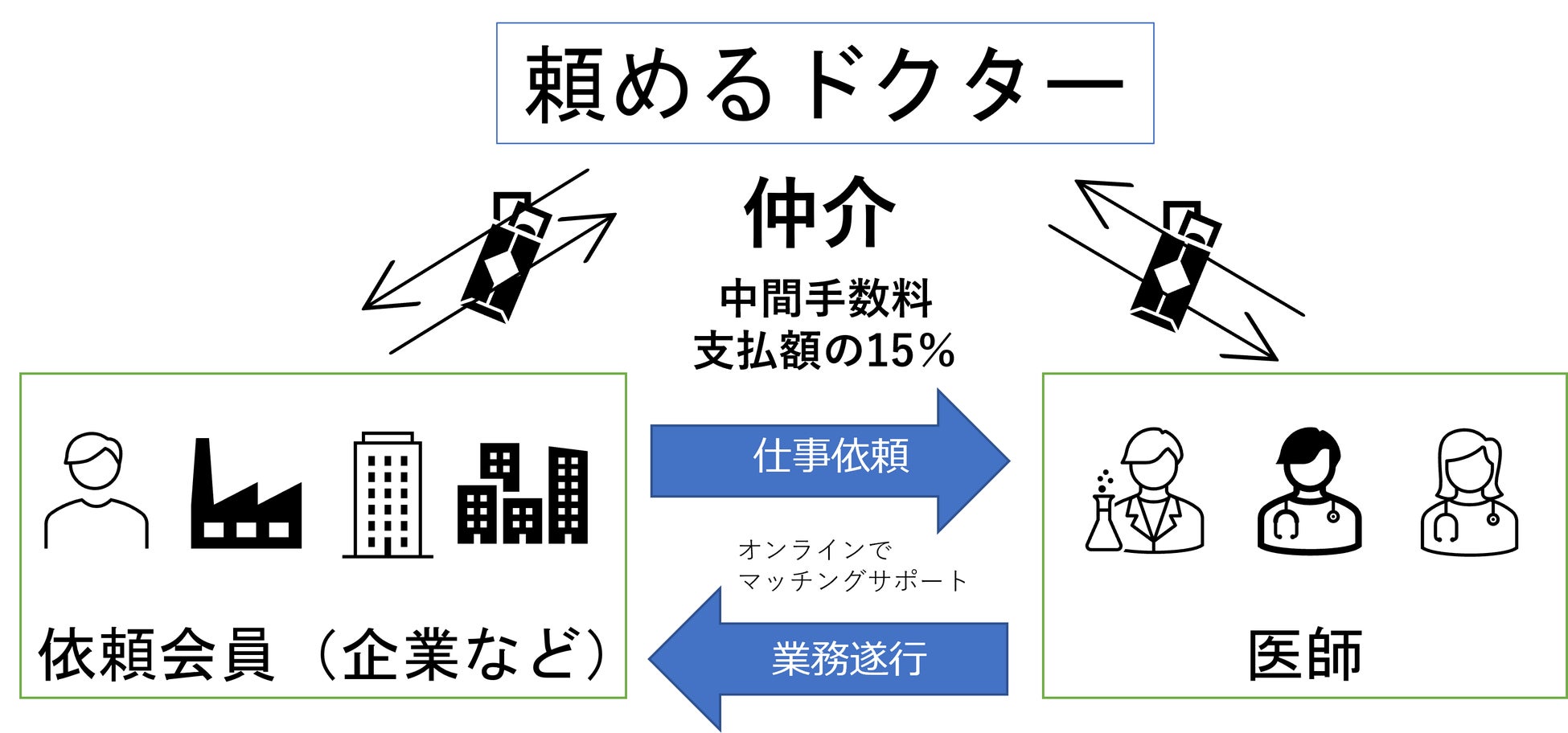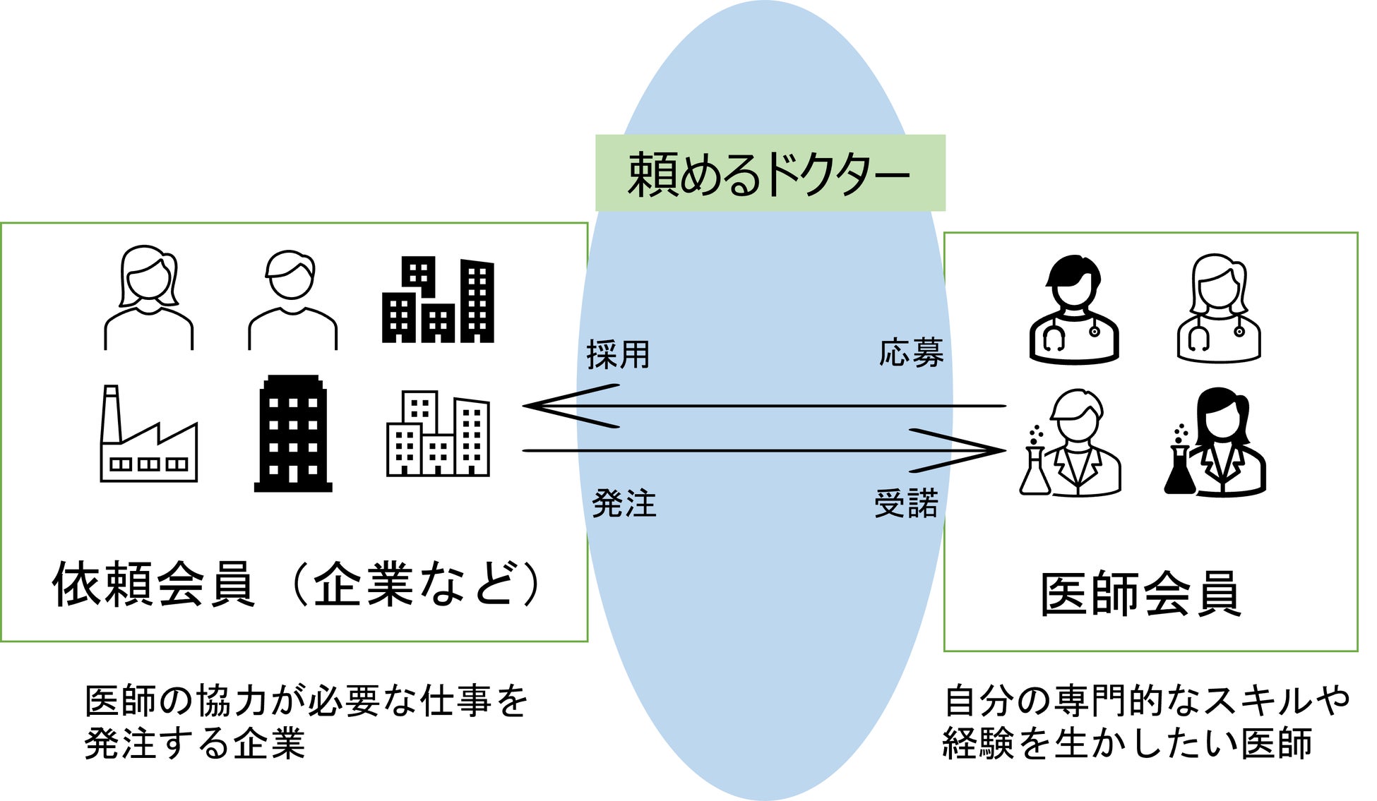 「頼めるドクター」は副業を探す医師と、医師に仕事を依頼したい企業や個人を繋ぐクラウドソーシングサービスです。サイト上に依頼したい仕事内容を掲示し、受注希望の医師とサイト上のメッセージ機能で連絡を取り合うことで、双方が納得する形でクラウドソーシングを行うことができます。エクスロー決済を採用しており、クラウドソーシングで問題となる料金の未払いなどの金銭トラブルを最小限にしています。本サービスは、医療記事作成や監修、医療機器・商品開発などの監修、医学論文の翻訳/解説、ビデオチャットシステムなどを用いた医学面でのコンサルテーションなど、企業が求めるさまざまな用途でお使いいただけます。