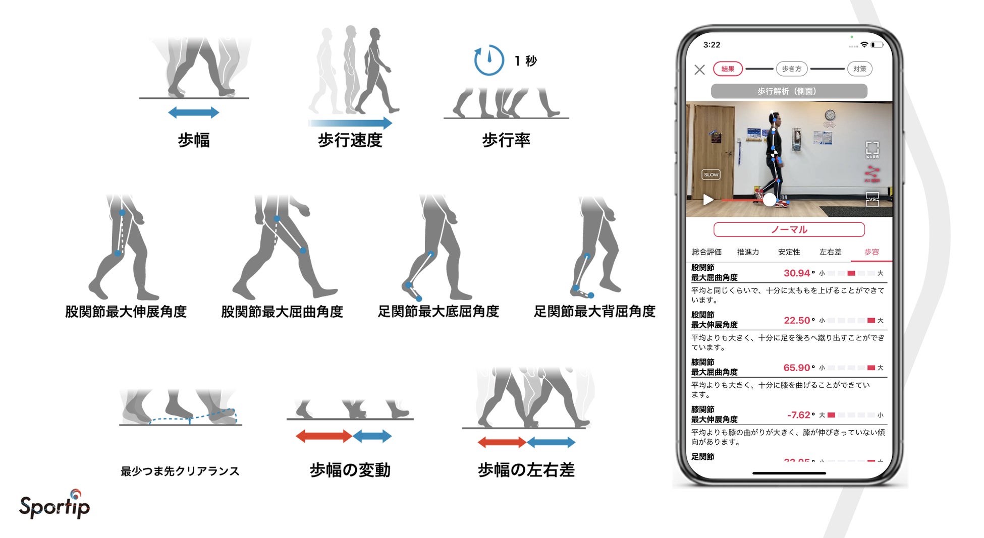 株式会Sportip(本社:東京都文京区、代表取締役CEO:高久 侑也、以下Sportip)が提供しているアプリ「Sportip Pro(スポーティップ プロ)」に歩行分析(側面)機能を追加しました。歩行解析(正面)機能は従来から存在しておりましたが、それに加え側面の解析を行うことでより詳細に多角的に歩行分析が可能になりました。個人の歩行特性をより詳細に分析して個別最適化された運動処方が可能となるため、指導・施術の質の向上とお客様の満足度アップにつなげていただくことが可能です。