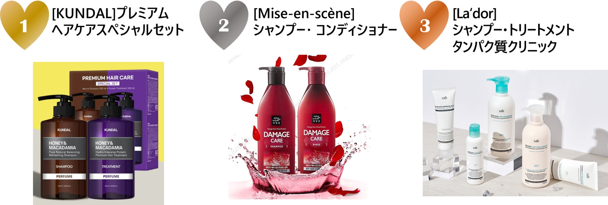 今月は、『シャンプー&コンディショナー』をピックアップして月間ランキングをご紹介します。1位には、韓国で複数の受賞歴を誇る[KUNDAL]がランクイン。豊富なうるおいを与えるマカデミアの実やハチミツなど、天然由来成分を用いたケアができます。2位は、ヘアセラムでも人気の[ミジャンセン]。3位には、ヘアケア専門ブランド[La‘dor]から髪のタンパク質に働きかけるアイテムがランクインしました。人工的な成分を含まない天然素材やノンシリコンといったシリーズが人気です。