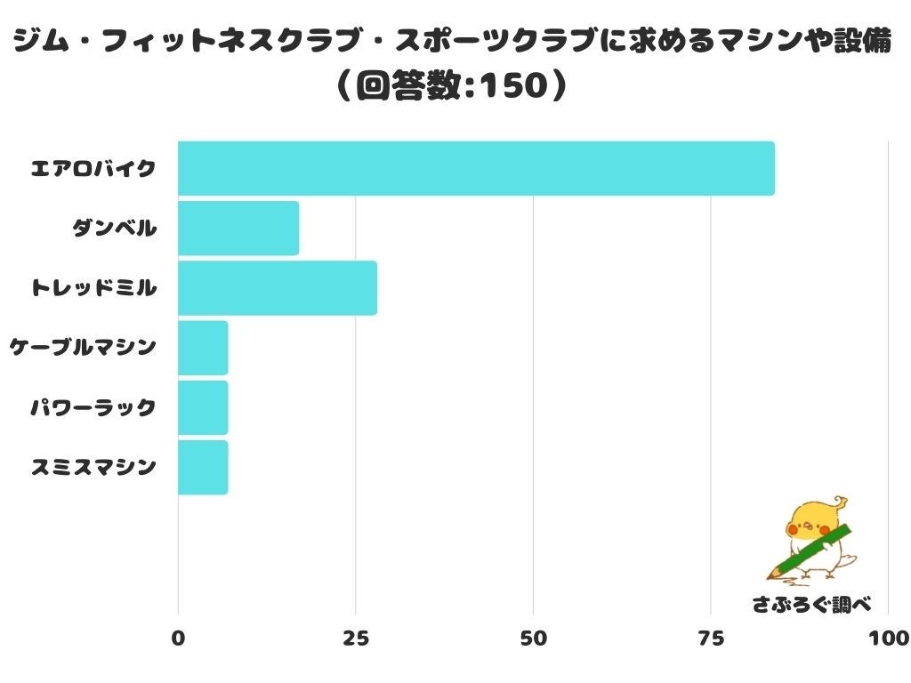 ジム・フィットネスクラブ・スポーツクラブに求めるマシンや設備をアンケートにて調査したところ、1位は「エアロバイク」でした。