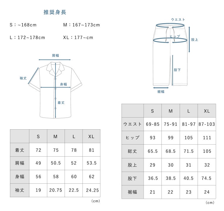 | サイズ | トップス、ボトムス:S・M・L・XL |