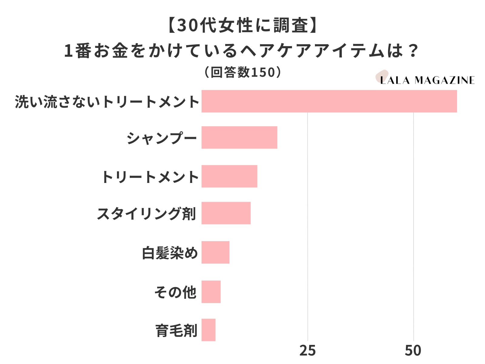 株式会社LALA(本社:京都府京都市、代表取締役:下川直人)が運営する、美容のプロがヘア・メイク・コスメの基礎知識や美容の雑学をわかりやすく解説するメディア「LALA MAGAZINE」は、30代の女性150人に「今1番気になっている髪の悩み」と「1番お金を使っているヘアケアアイテム」についてアンケート調査を実施しました。その結果をサイト内(https://lalahair.co.jp/magazine/hair/30s-hair-troubles/)にて公開しました。