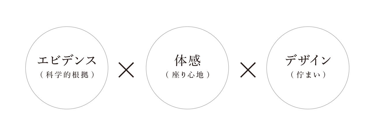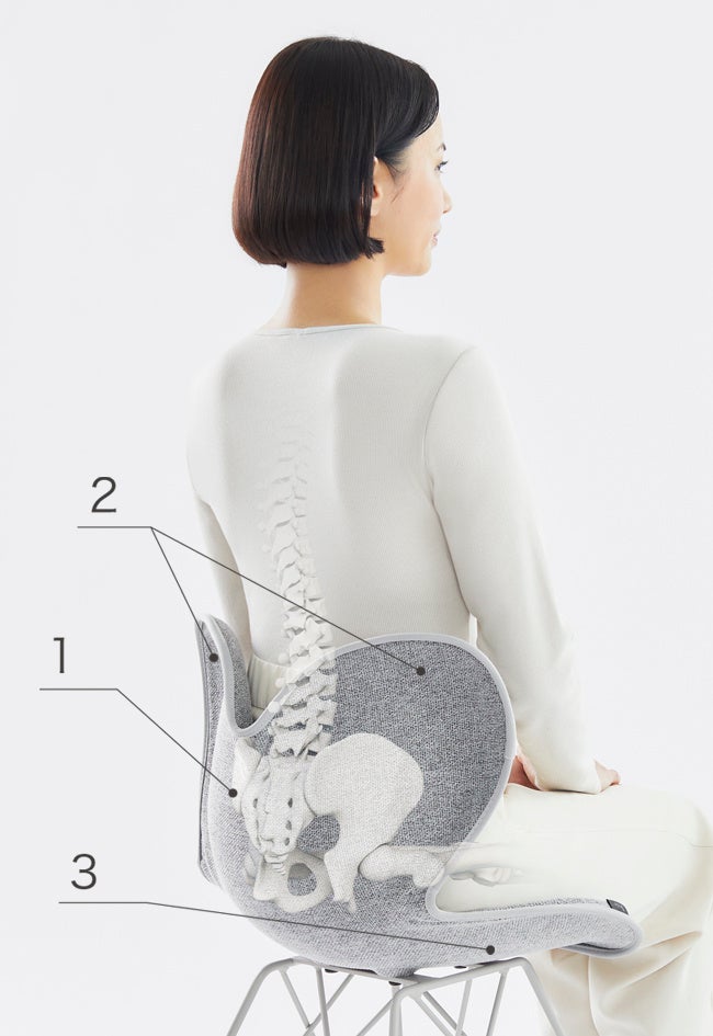 人々の安全、安心、快適、そして健康を支える“人間工学”に基づき開発した独自構造と、体の歪みをつくる根本的な原因を追究し、骨盤などを矯正し、身体の全体的なバランスを整えていくカイロプラクティックの施術者“カイロプラクター”のメソッドを融合。「立てる」「支える」「分散する」の3つのポイントで、背骨がS字カーブを描く理想の姿勢ケア“S字姿勢“をサポート。本格的な姿勢ケアを実現します。