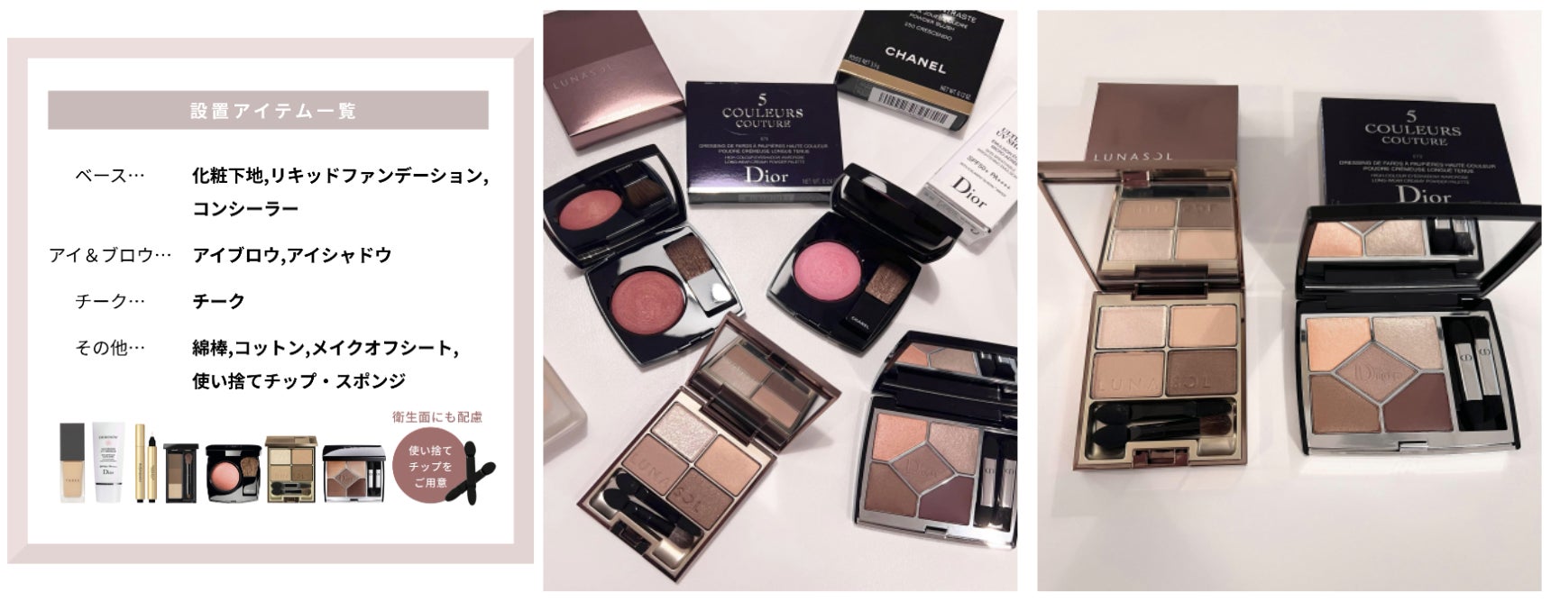 衛生面に配慮し、使い捨てチップ等をお使いいただけない、肌に直接触れる口紅やフェイスパウダー等は設置しておりません。